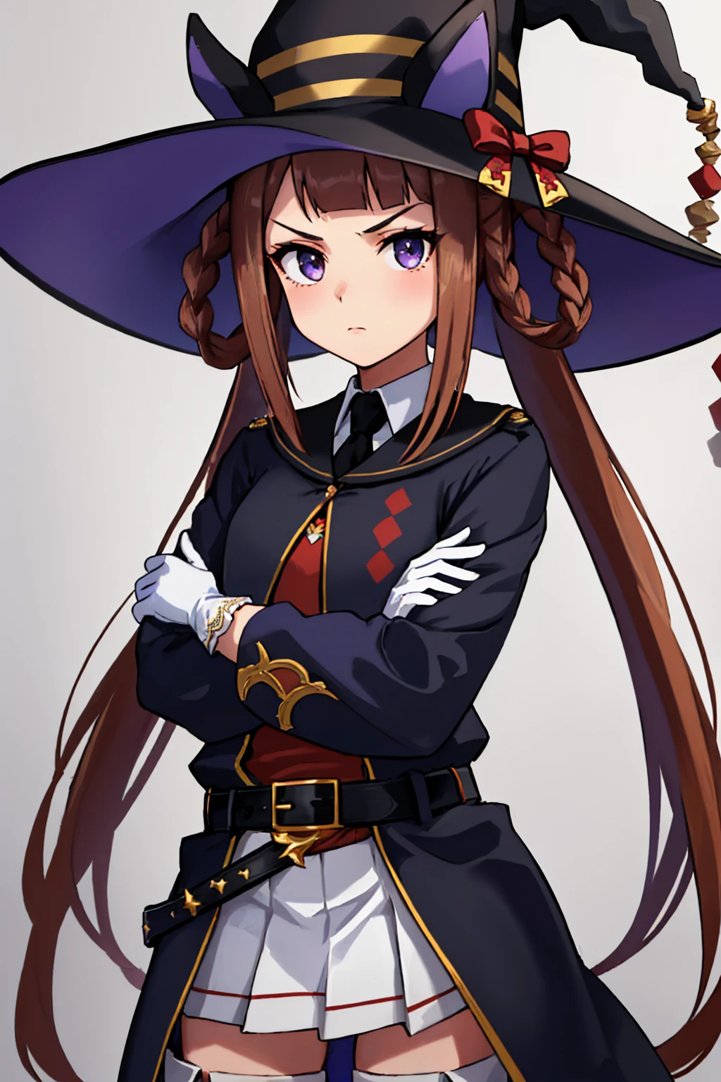 witch hat, robe, white gloves, white skirt, thigh boots, belt