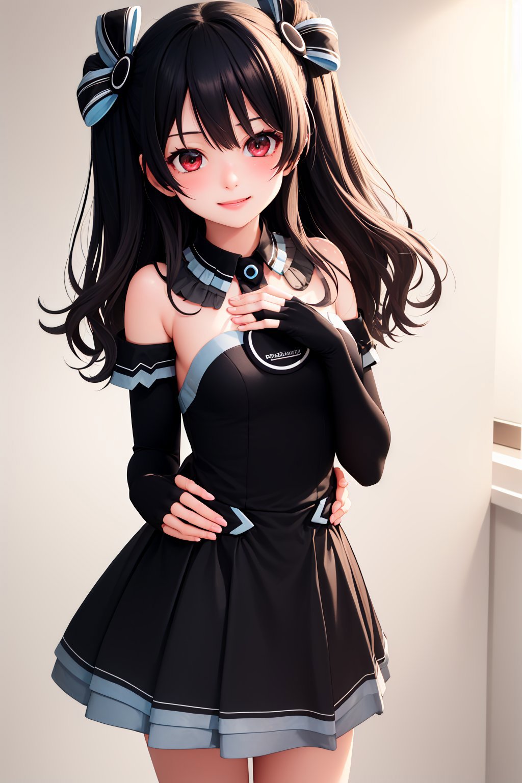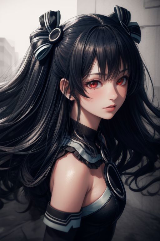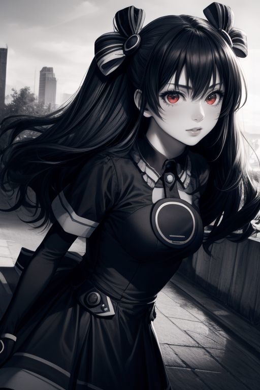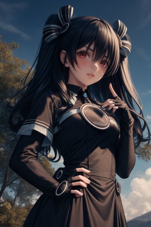 Human: black hair, two side up, hair ribbon, red eyes, black dress, fingerless gloves