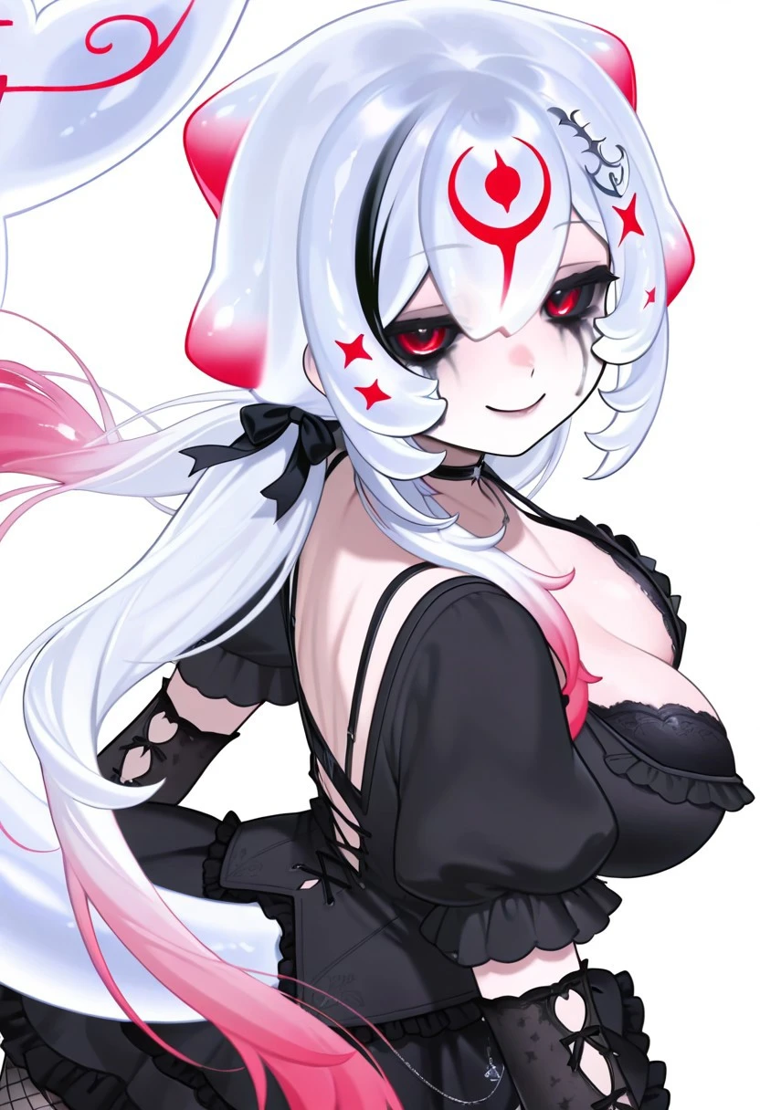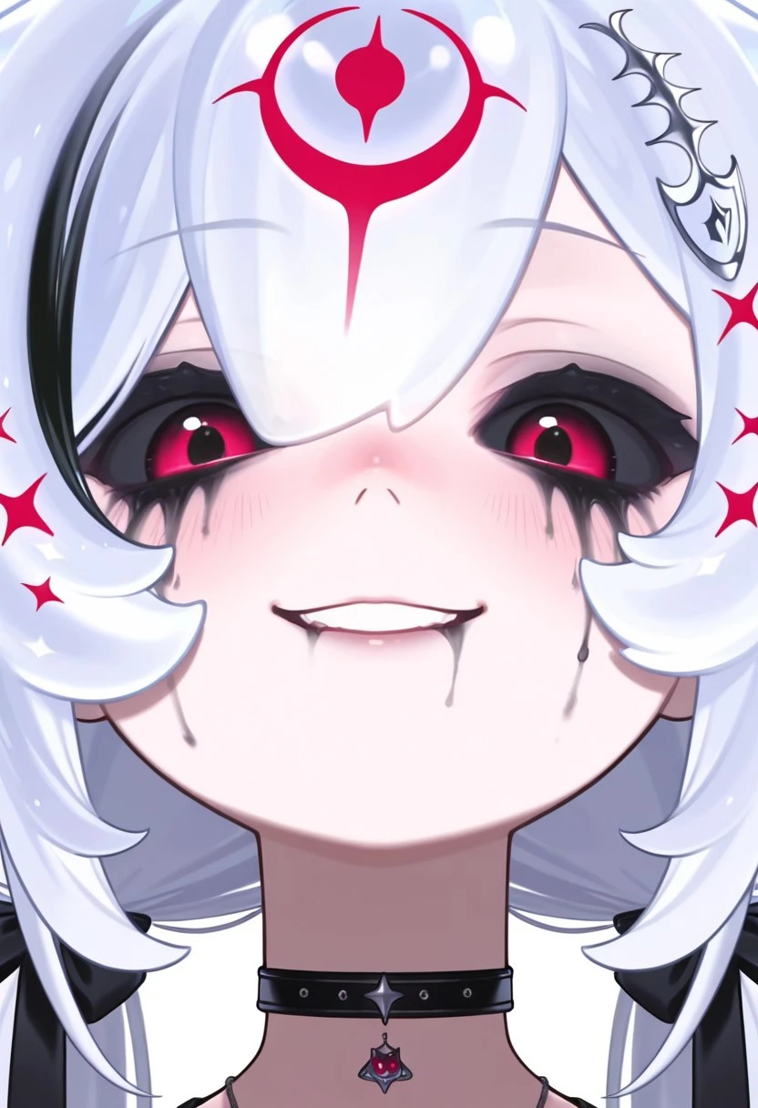 Rocker Bao, goth_bao, virtual youtuber, red eyes, black sclera, runny makeup, white hair, bangs, long hair, low twintails, gradient hair, streaked hair, hair bow, multicolored hair, black choker, jewelry,