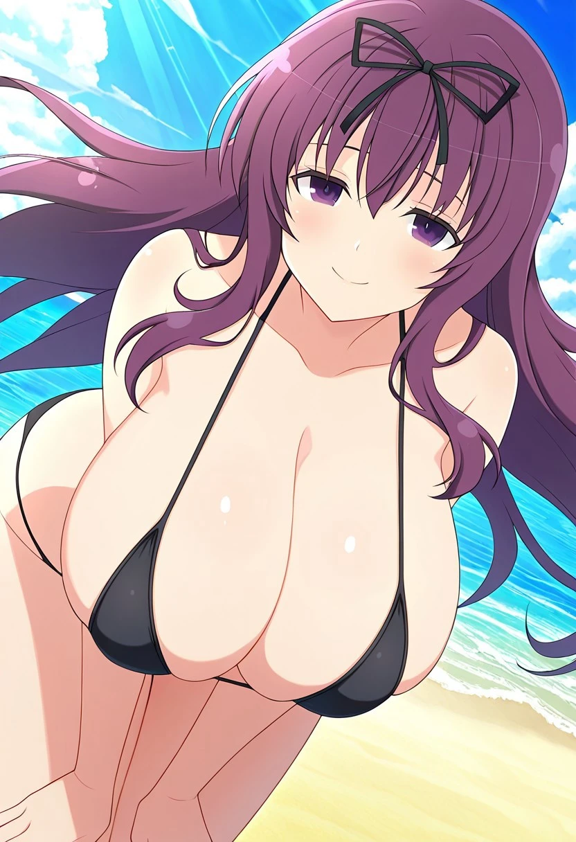 Murasaki,purple hair, long_hair, huge_breasts,purple eyes, hair ribbon, black ribbon,