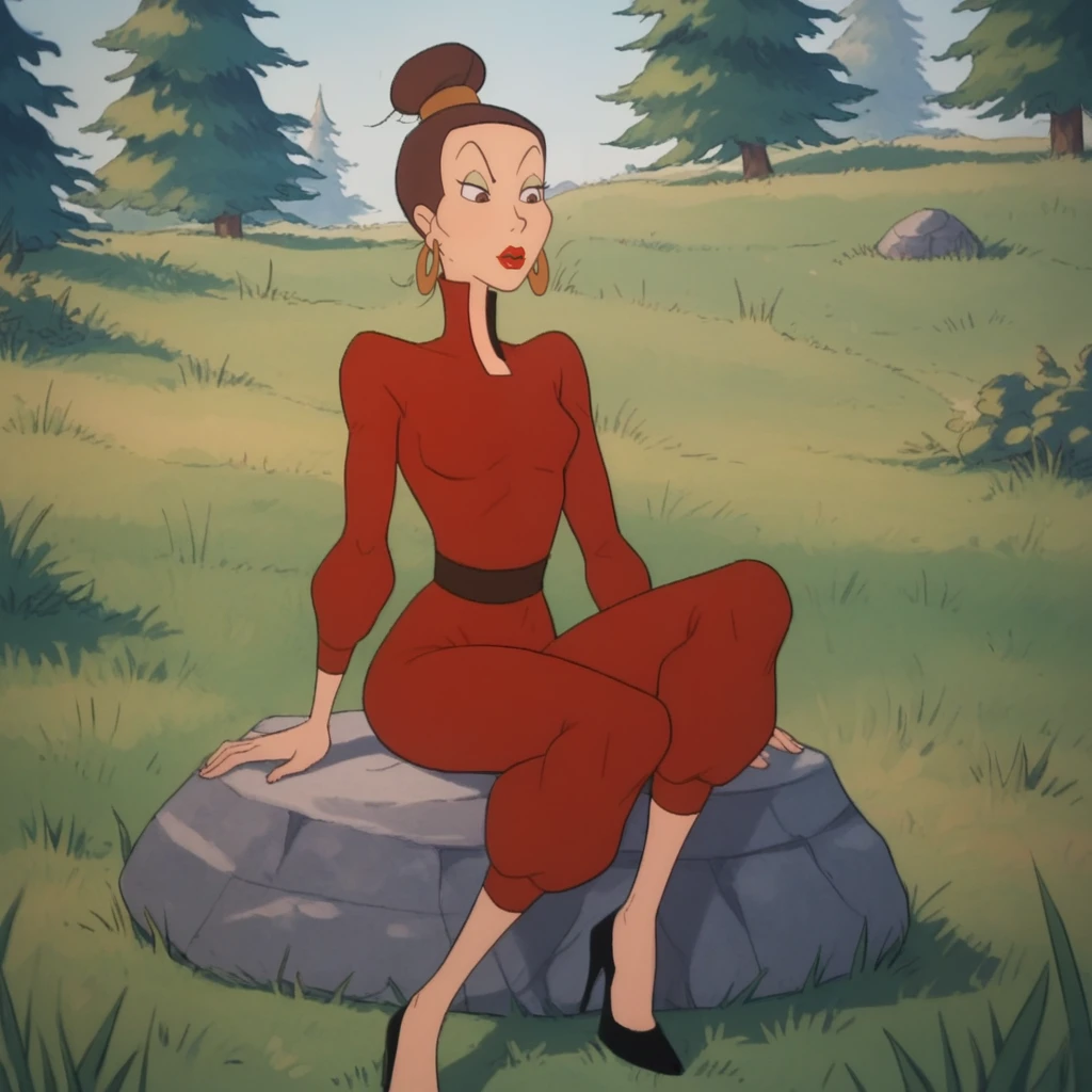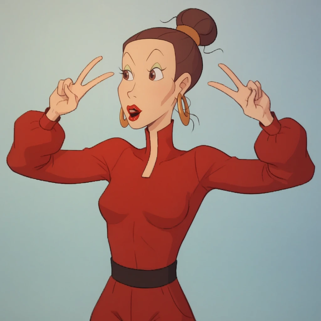 Emma, 1girl, solo, brown hair, hair bun, brown eyes, lipstick, hoop earrings,