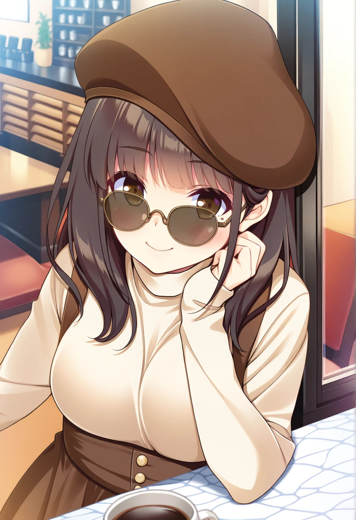 suspender skirt,suspenders,high-waist skirt,sweater,brown beret,sunglasses,
