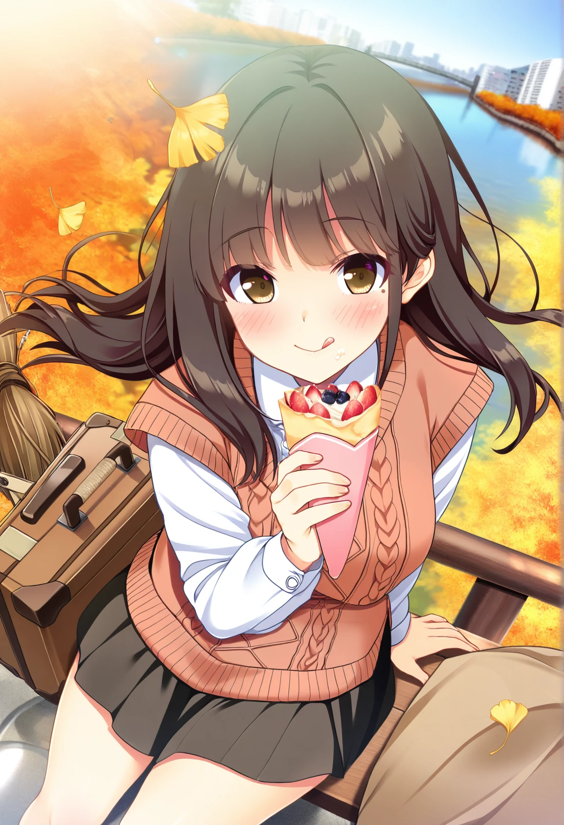 brown sweater vest,aran sweater,cable knit,white collared shirt,long sleeves,dress shirt,black pleated miniskirt,居家休闲装