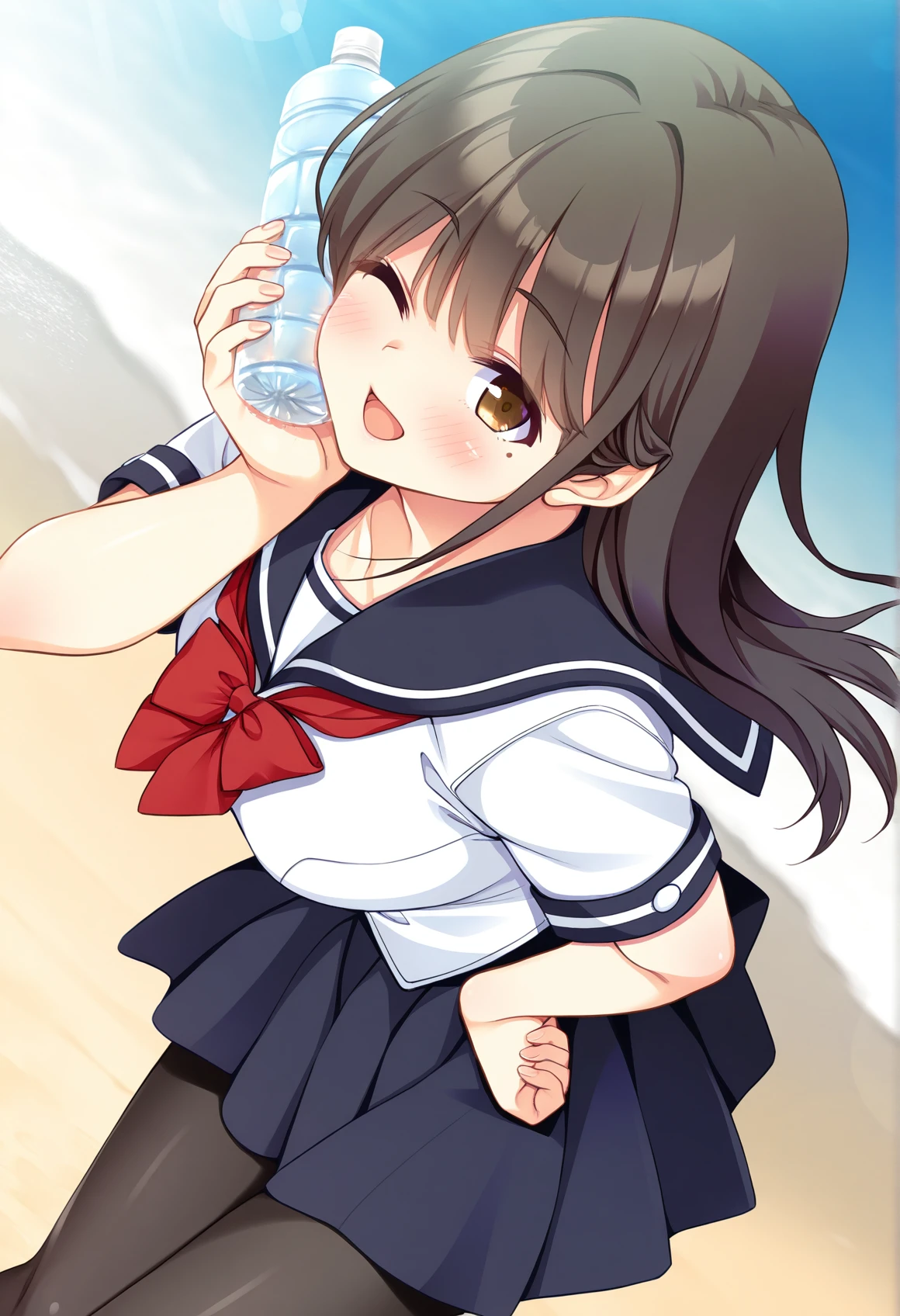 school uniform,serafuku,pleated skirt,black pantyhose,red bowtie,short sleeves,