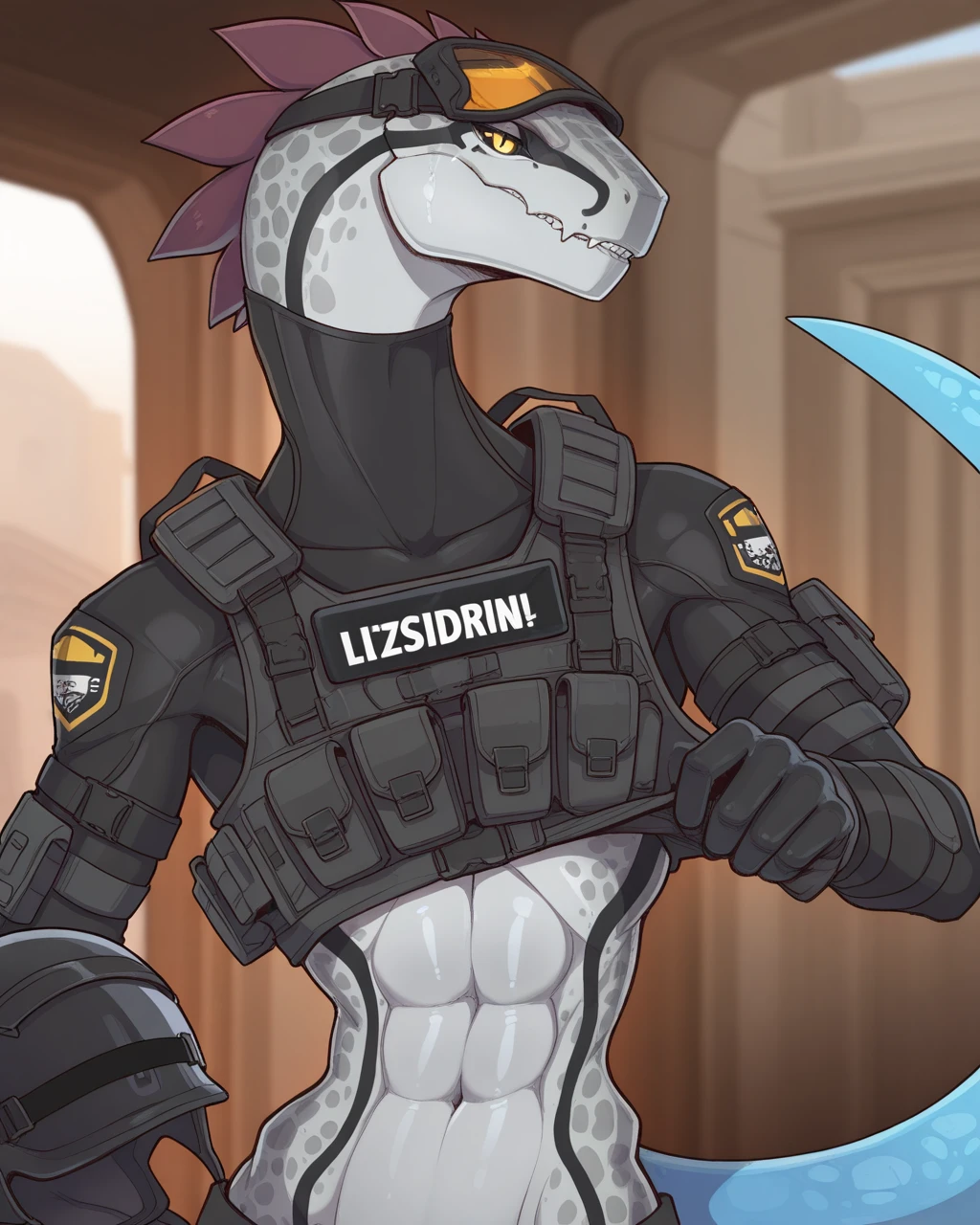 yuh1ss, lizardman, reptile, scalie, dark grey stripe, spots, body markings, grey body, yellow eyes, black sclera, slit pupils, light belly, blue tail, blue mouth, sharp teeth, blue tongue, maroon hair, pecs, narrow waistCharacter negative design trigger words: