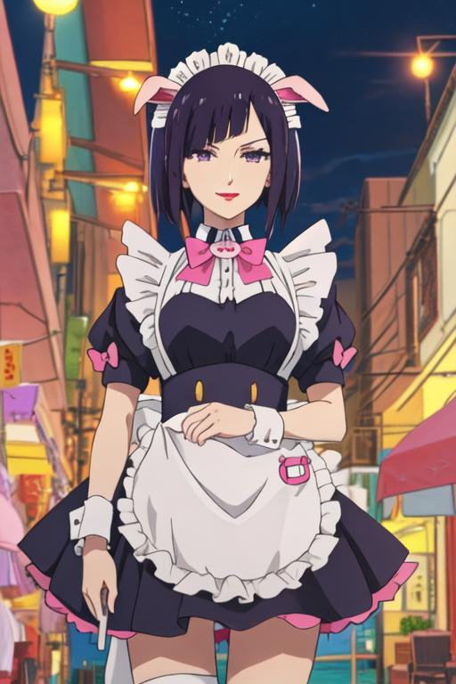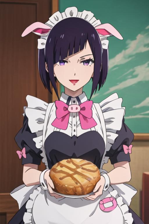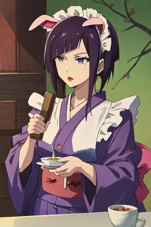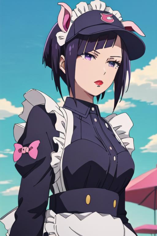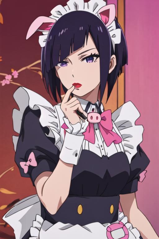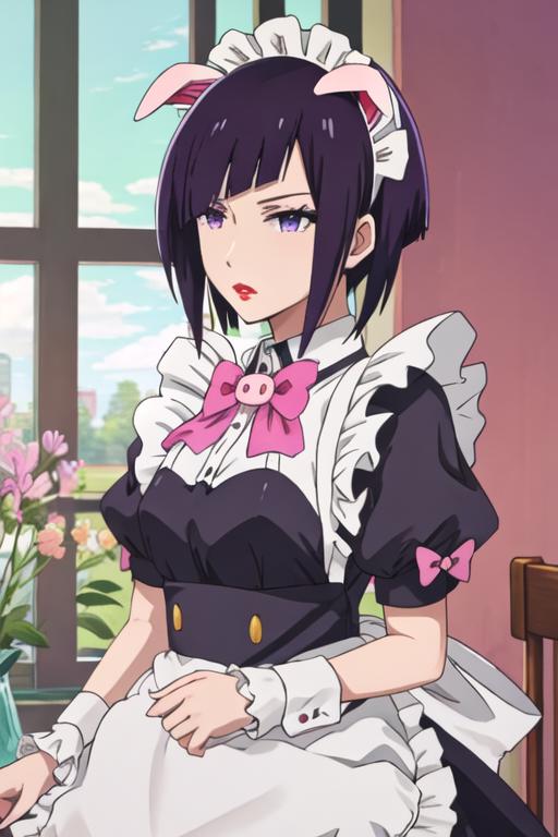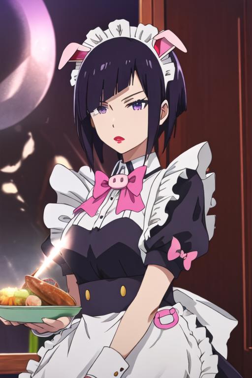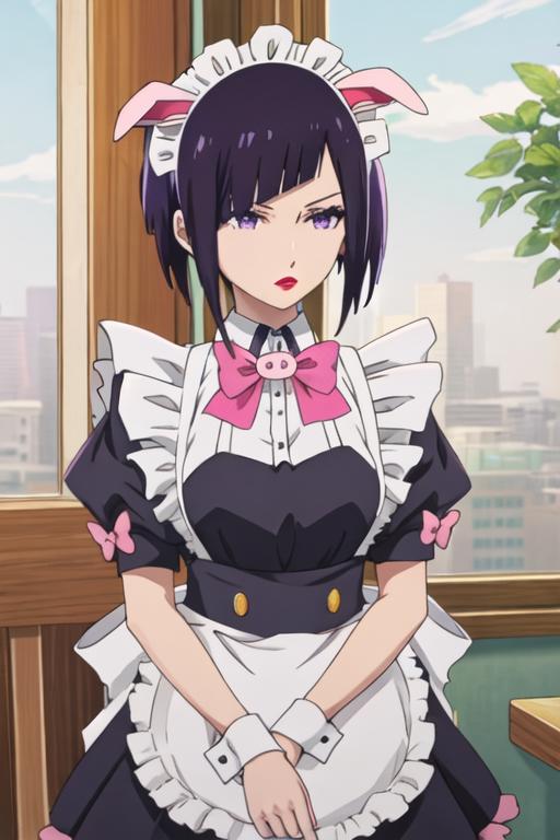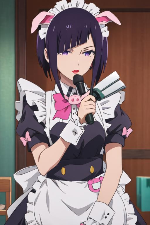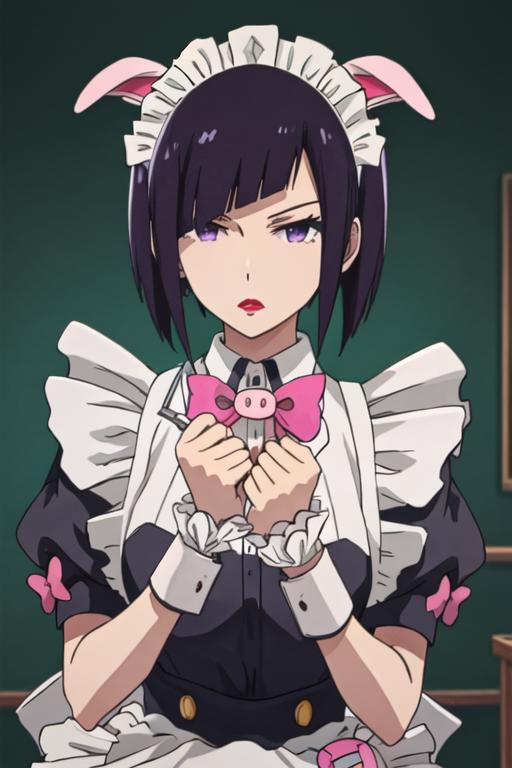 The trigger word is mannen_ranko_akibameidosensou, and the recommended tags are best quality, masterpiece, highres, solo, {mannen_ranko_akibameidosensou:1.15}, short_hair, purple_eyes, black_hair, maid_headdress, bow, bangs, animal_ears, purple_hair, pink_bow, apron, lipstick, pig_ears, fake_animal_ears.