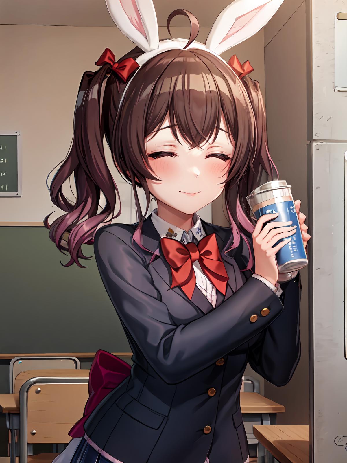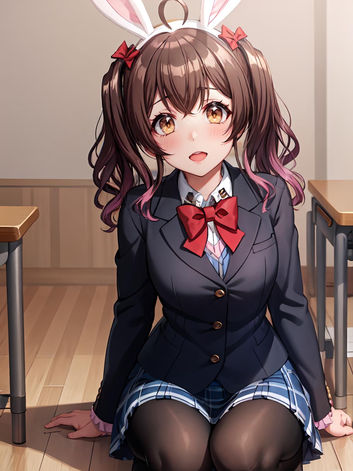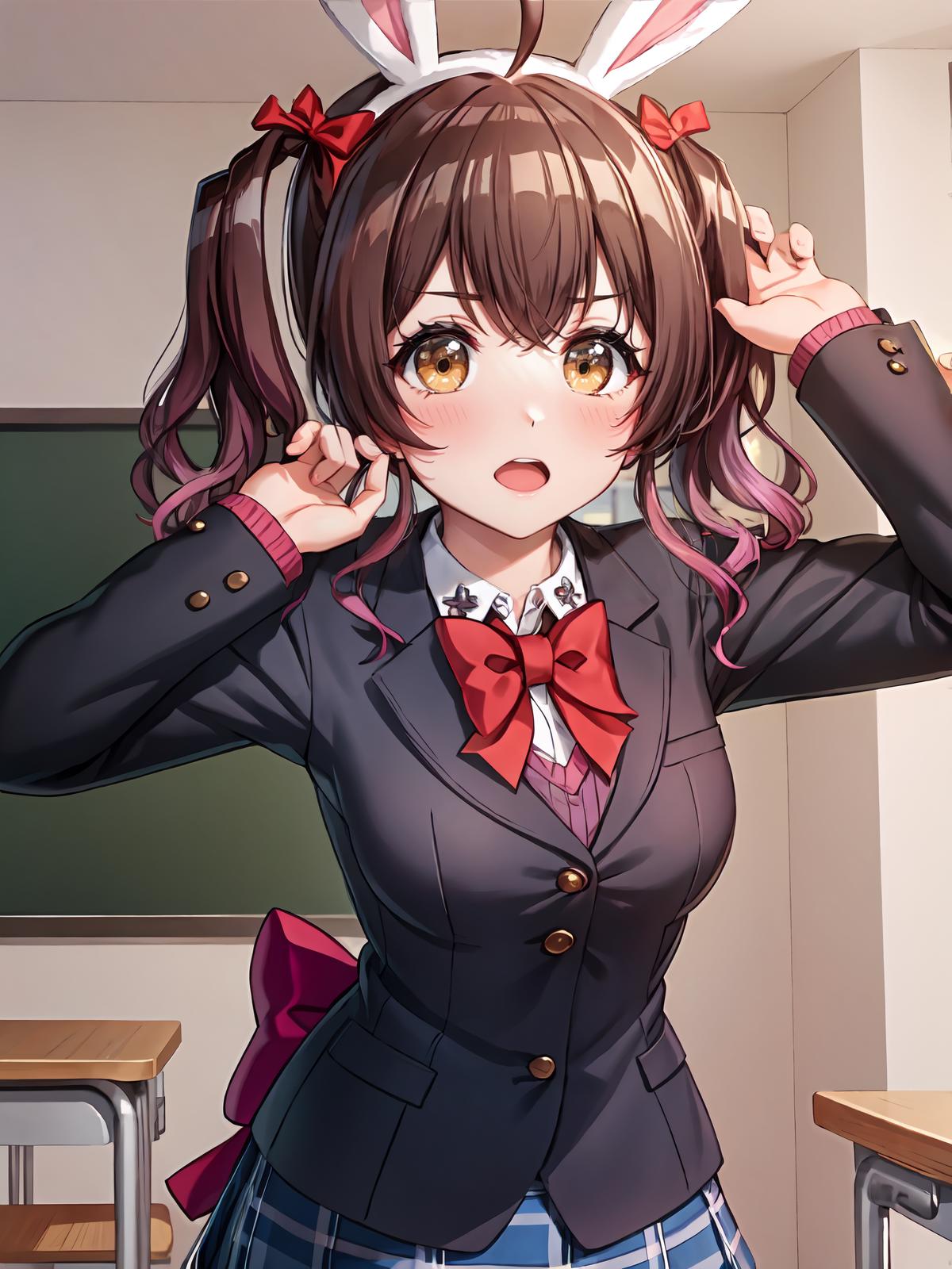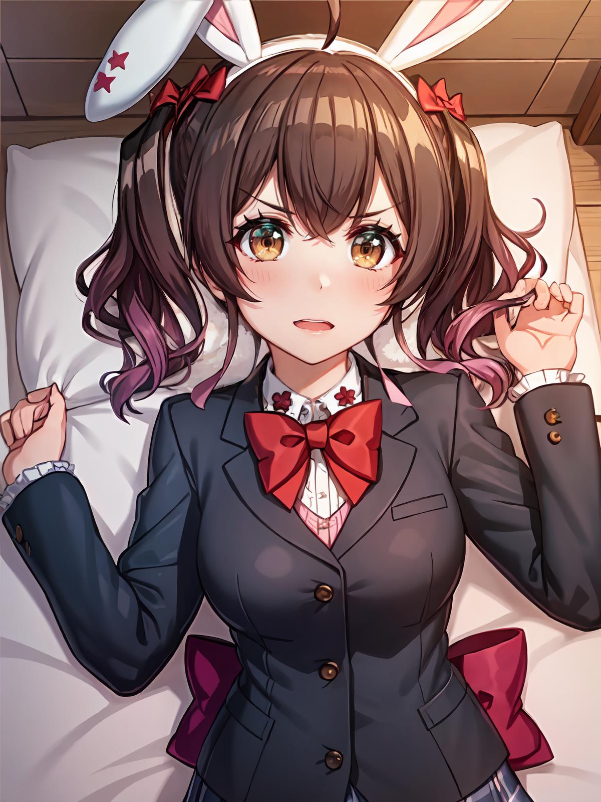 Prompts: red bowtie,black jacket, collared shirt, purple hair,school uniform, bowtie, jacket, ahoge skirt, hair bow,frills bangs shirt, gradient hair, fake animal ears,rabbit ears, yellow eyes, twintails, multicolored hair,school uniform,
