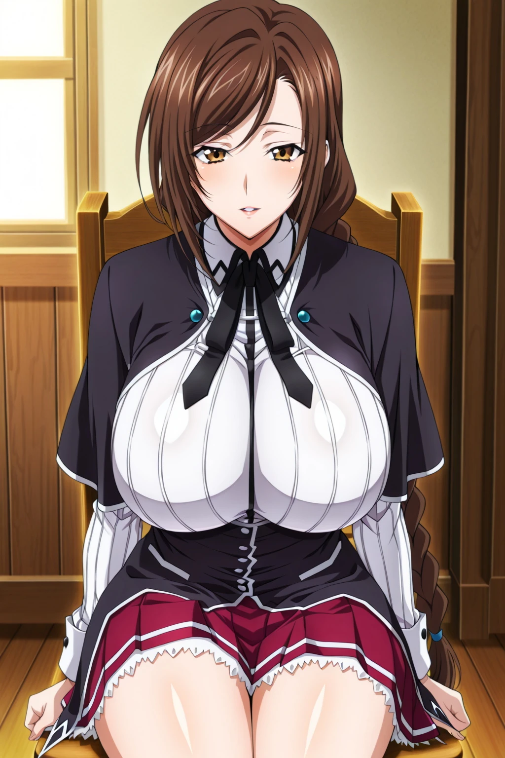neck ribbon, capelet, black capelet, long sleeves, skirt, red skirt, miniskirt, Bare legs,