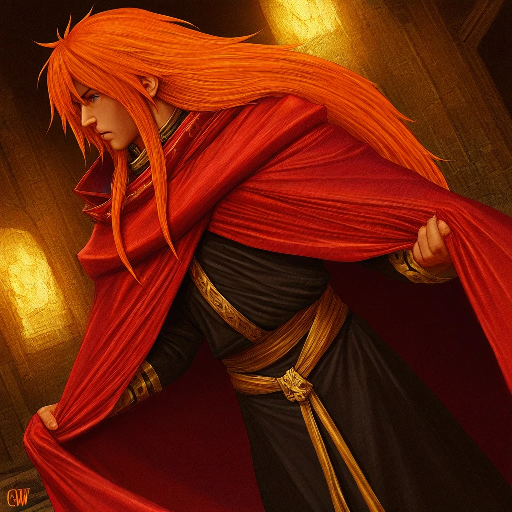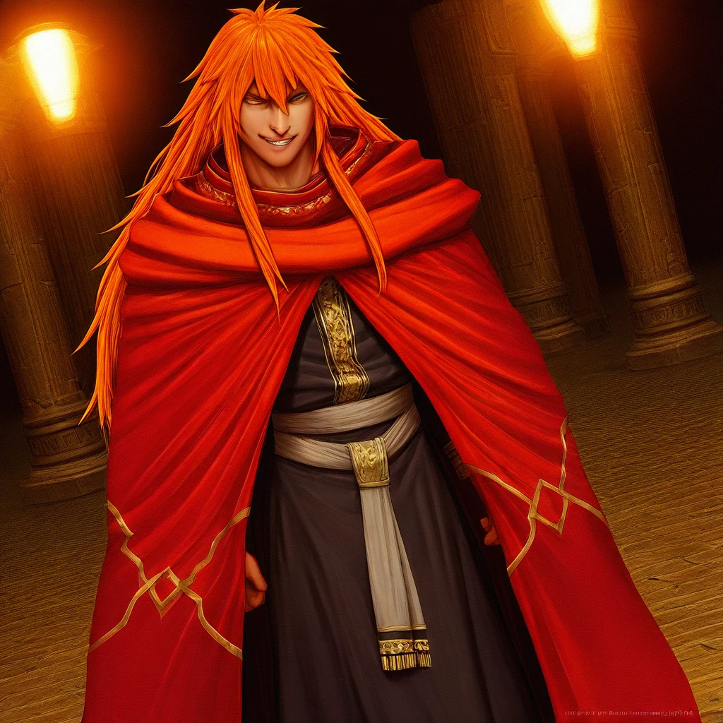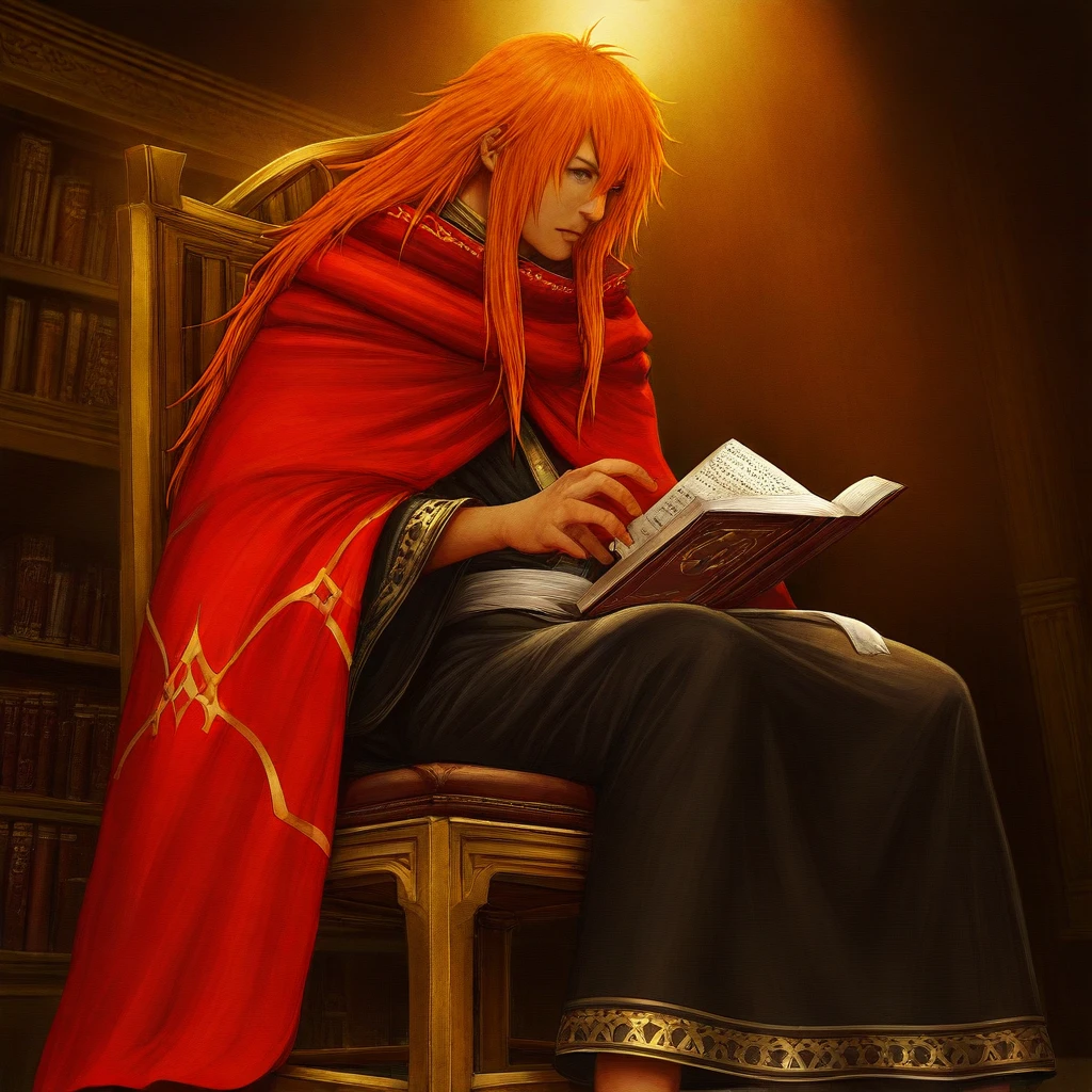Male focus, red cloak, black robes, sash, orange hair, purple eyes