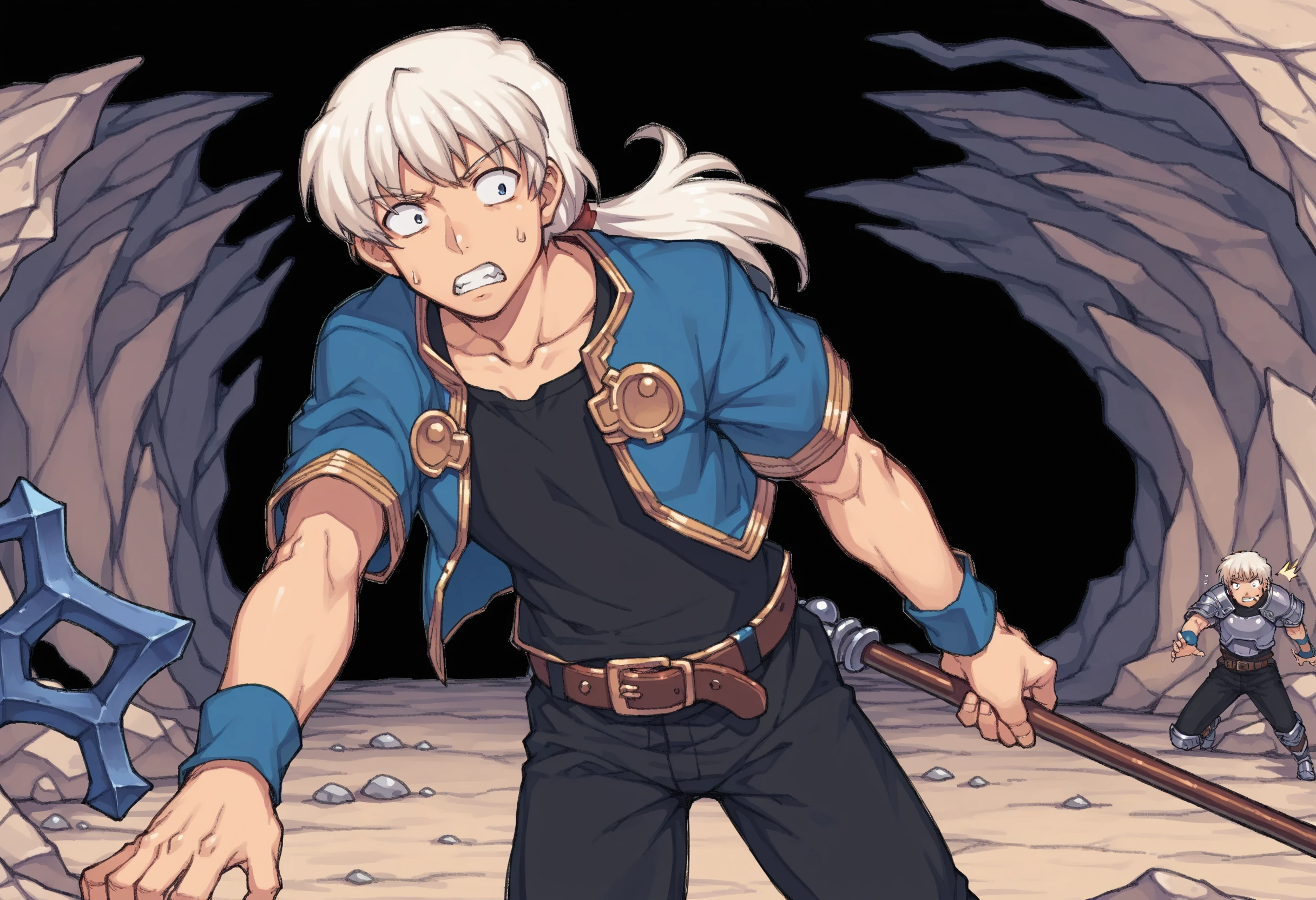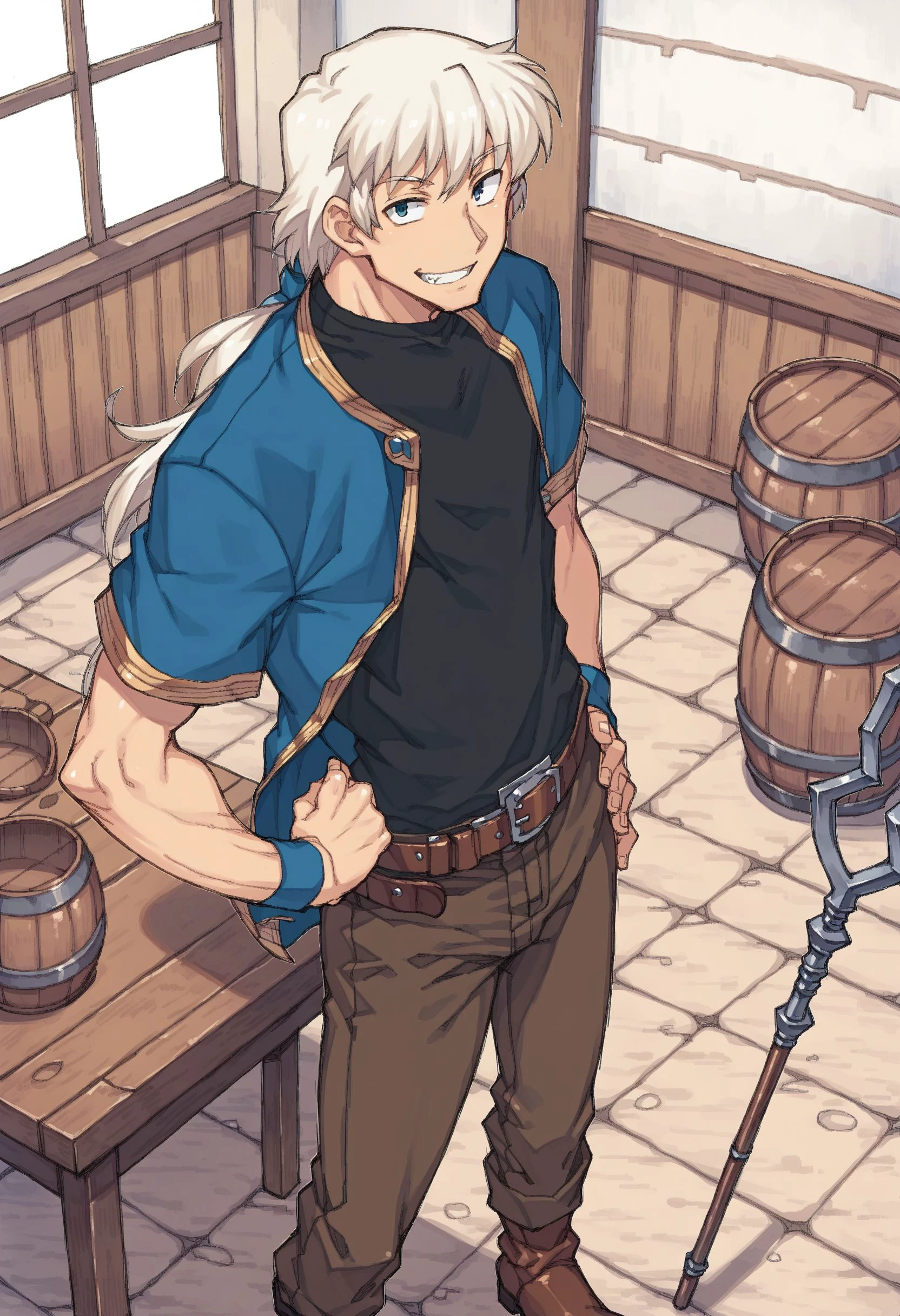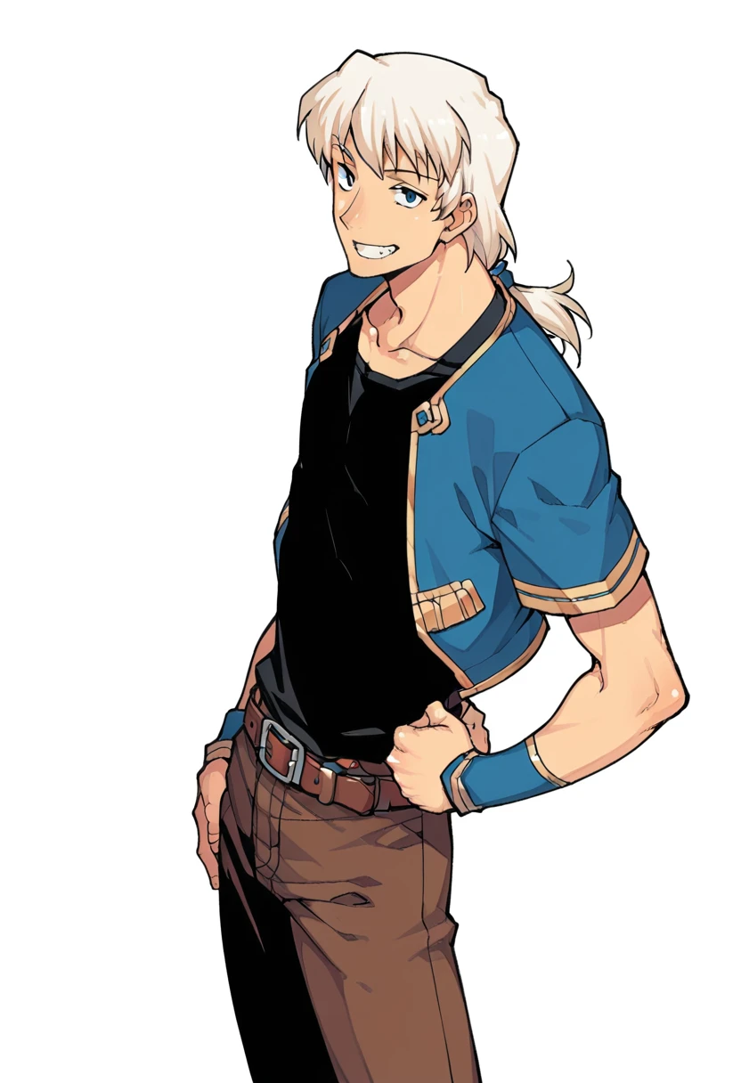 sw_heathcliff, blue cropped jacket, short sleeves, black shirt, blue wristband, belt, black pants,