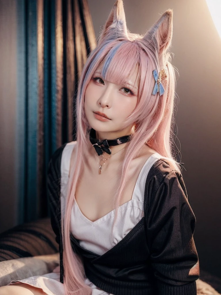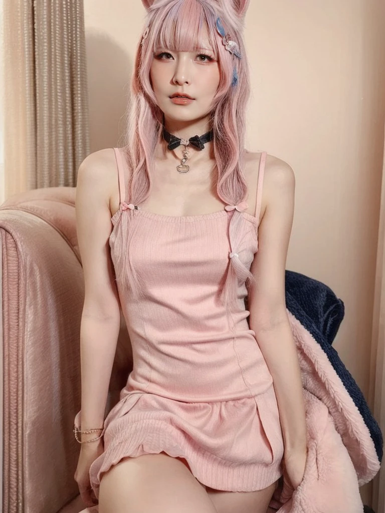 Recommend prompt: 1girl, solo, looking at viewer, realistic, photorealistic, portrait, asian, blunt bangs, lips, animal ears, pink hair, choker, long hair, breasts, small breasts, navel, swimsuit, bikini, bow, underwear, thighhighs,