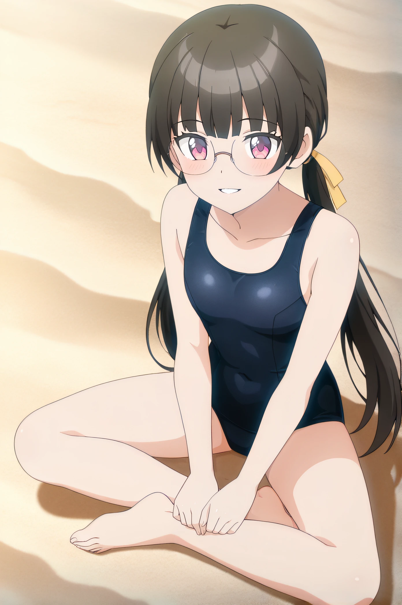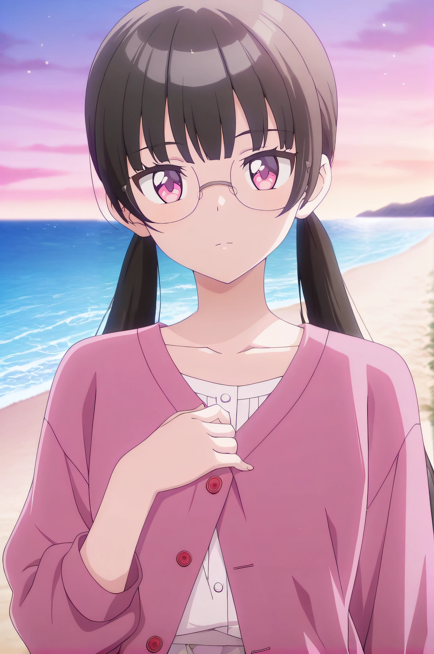 akane, black hair, long hair, pink eyes, pink pajama, white frills, collarbone