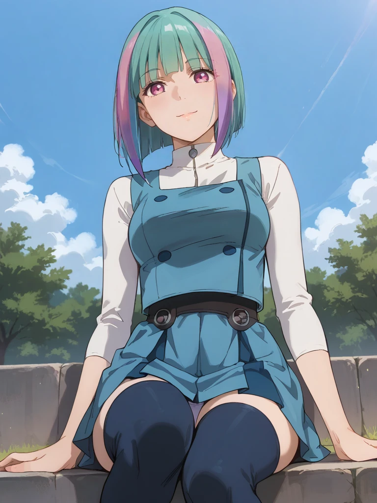 cynress,blue cape,white long sleeved turtleneck shirt,short sleeveless blue dress,buttons,black belt,blue skirt,zettai ryouiki,blue thigh boots