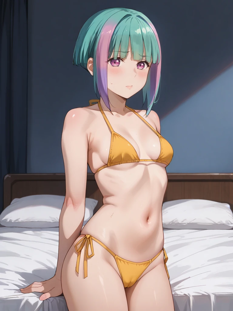 cyanbluestar,short aqua hair,blunt bangs,multicolored hair,streaked hair,pink hair,purple eyes