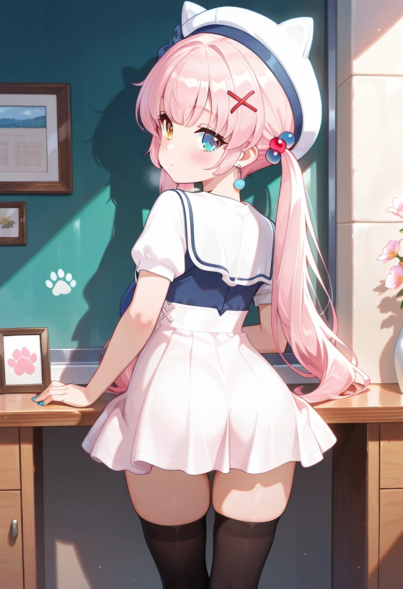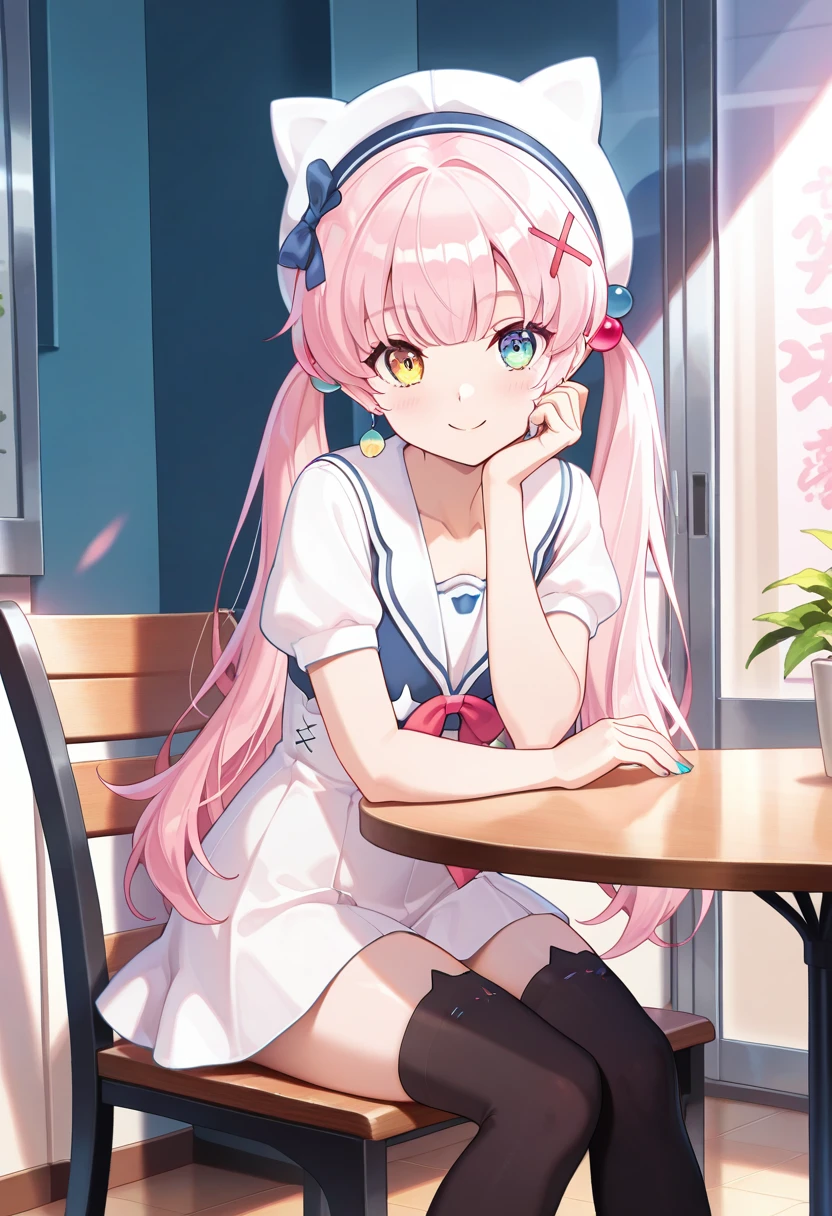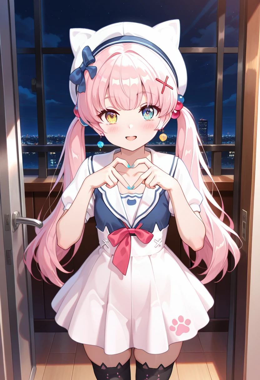 eksvd, pink hair, long hair, low twintails, hair bobbles, cat ears hat, x hair ornament, yellow blue heterochromia, vd sailor dress, cat ears thighhighs, black thighhighs, earrings, nail polish, yellow nail, blue nail,
