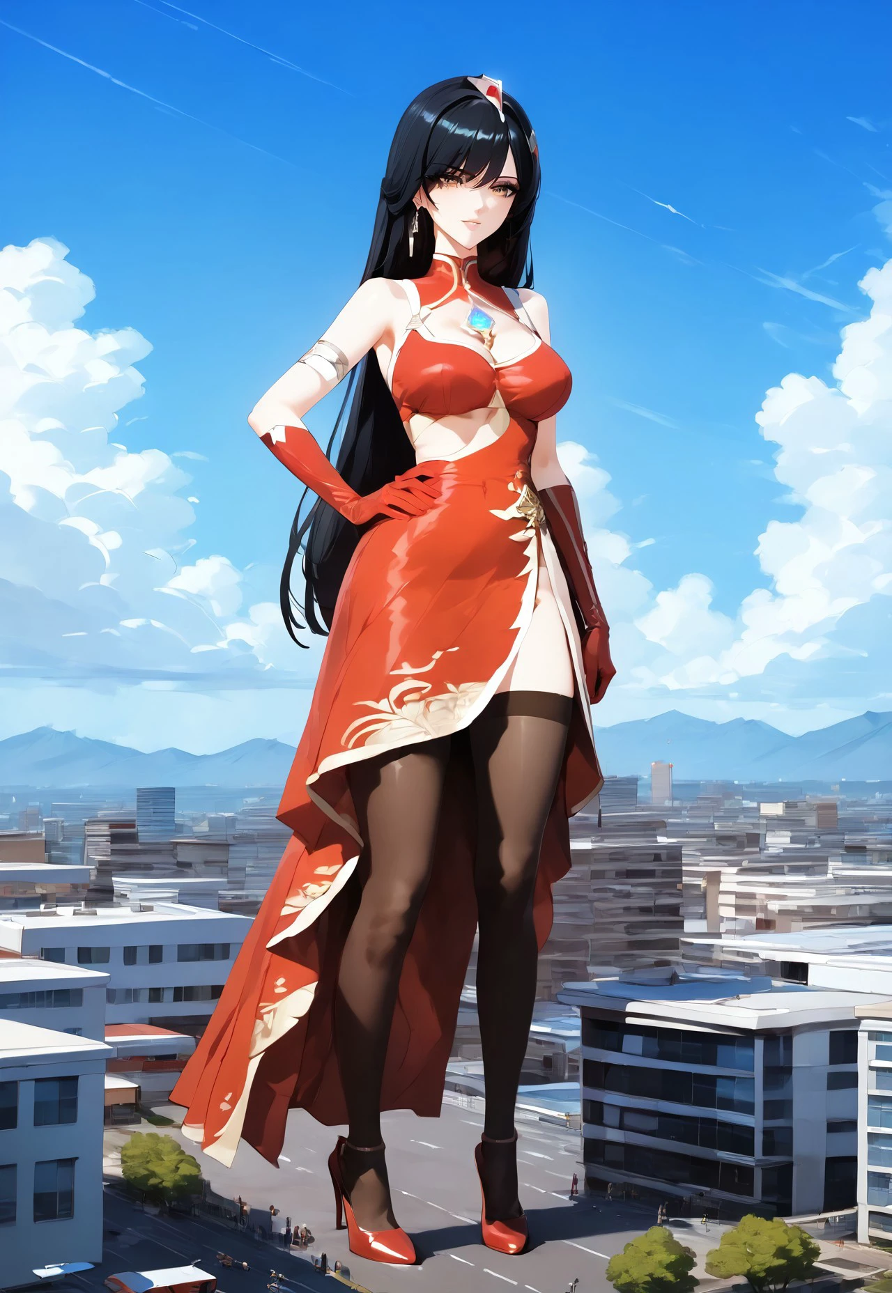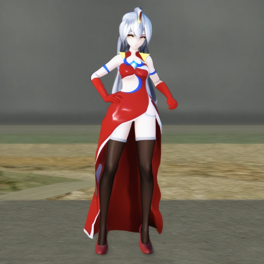 cosmos1, ultragirl, black hair, dress, red high heels, chest jewel,