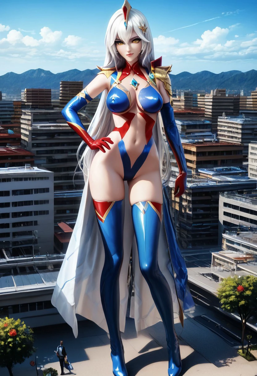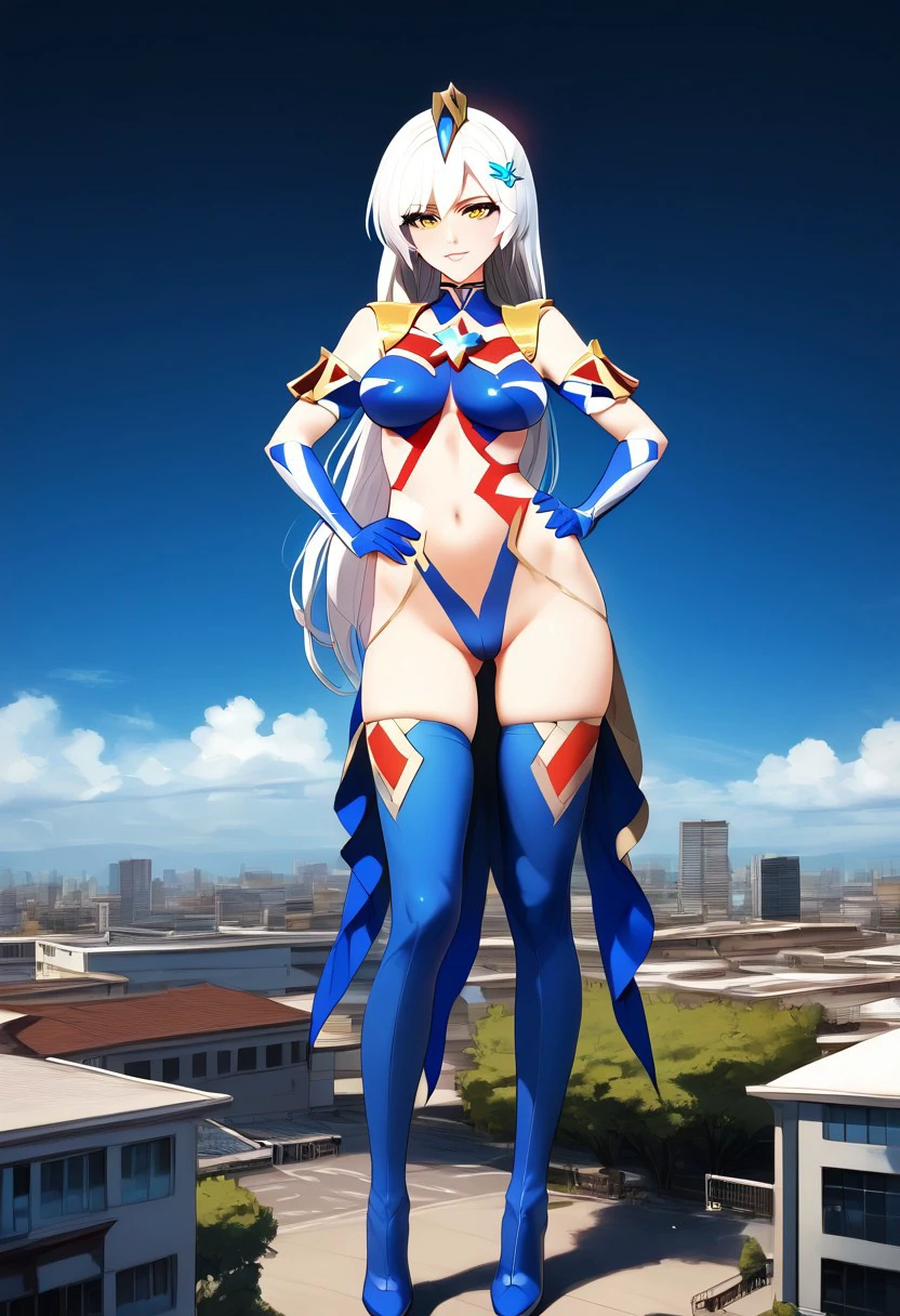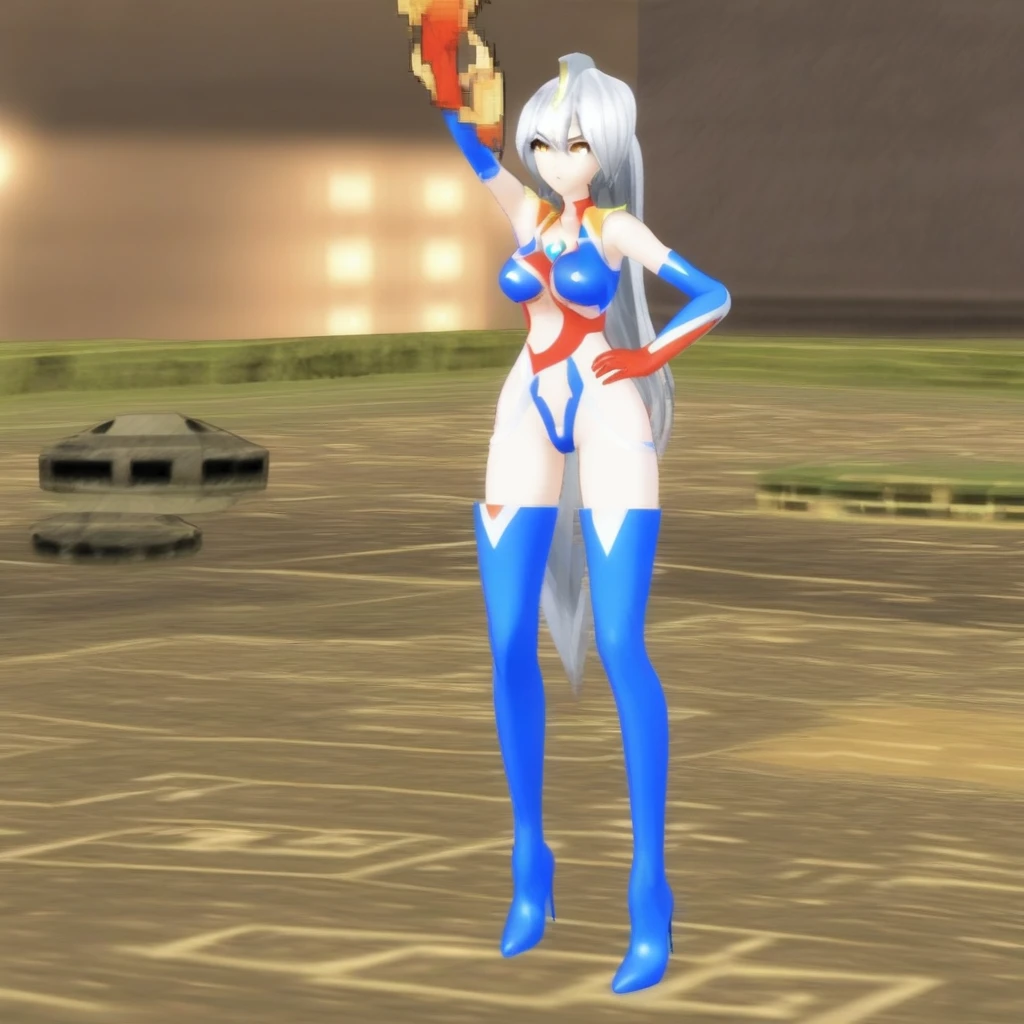 cosmos2, ultragirl, white hair, leotard, blue thighhighs, chest jewel,