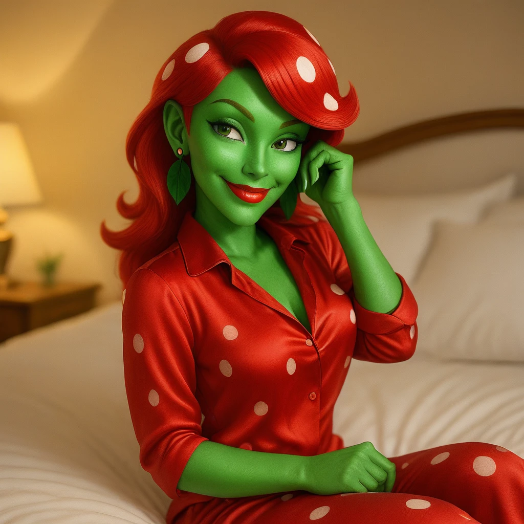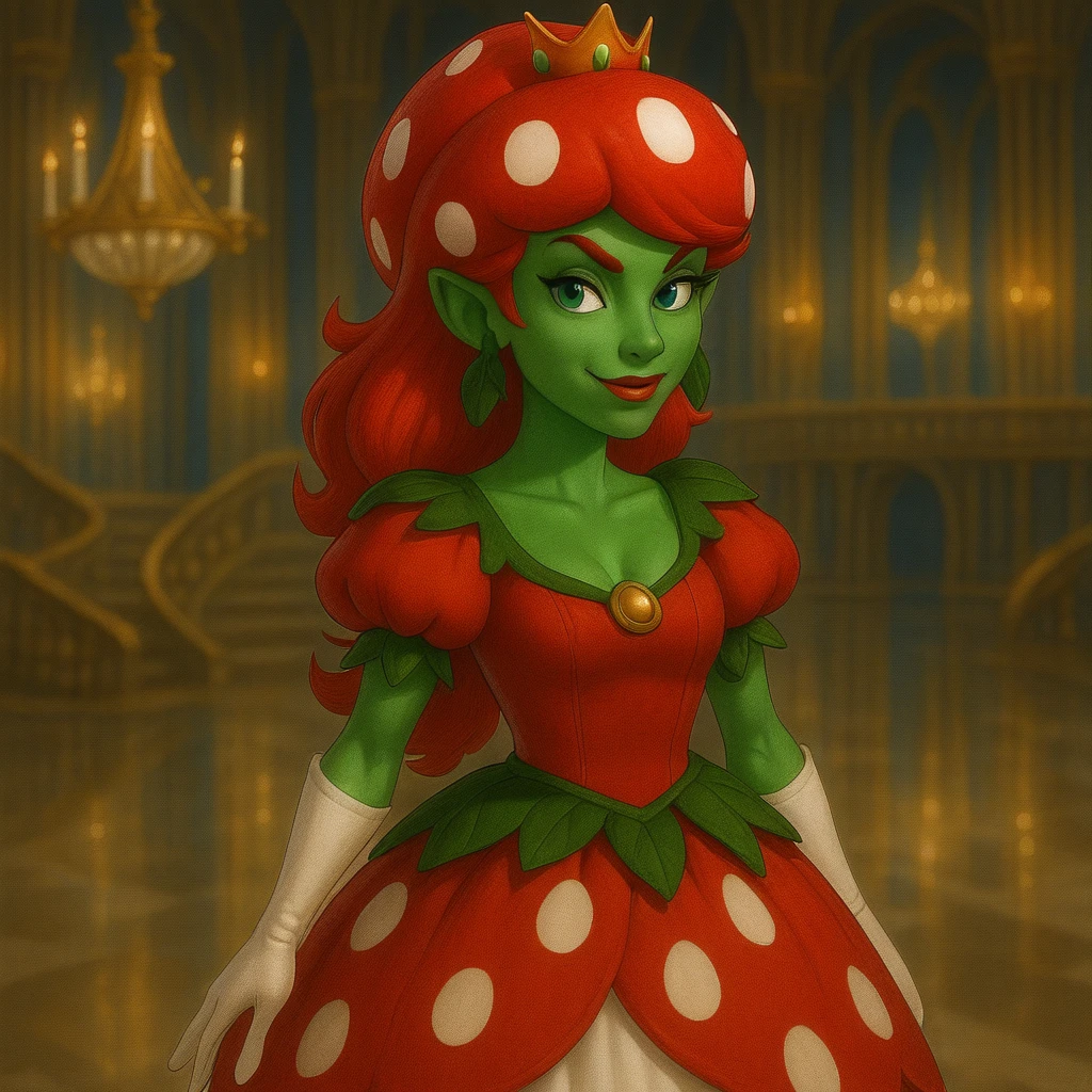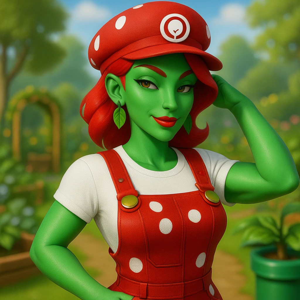Piranhette, red clothes, red lipstick, green skin, plant woman, red hair with white spots, red hair, white spots in hair, leaf earrings, sharp teeth,