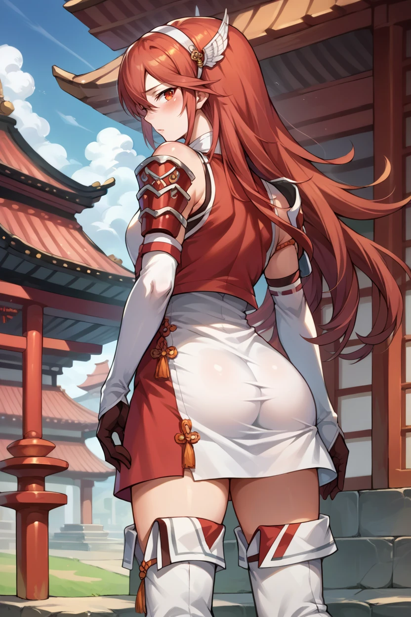 Add "wing hair ornament, hairband, shoulder armor, red and white dress, elbow gloves, thigh boots" for her typical look.