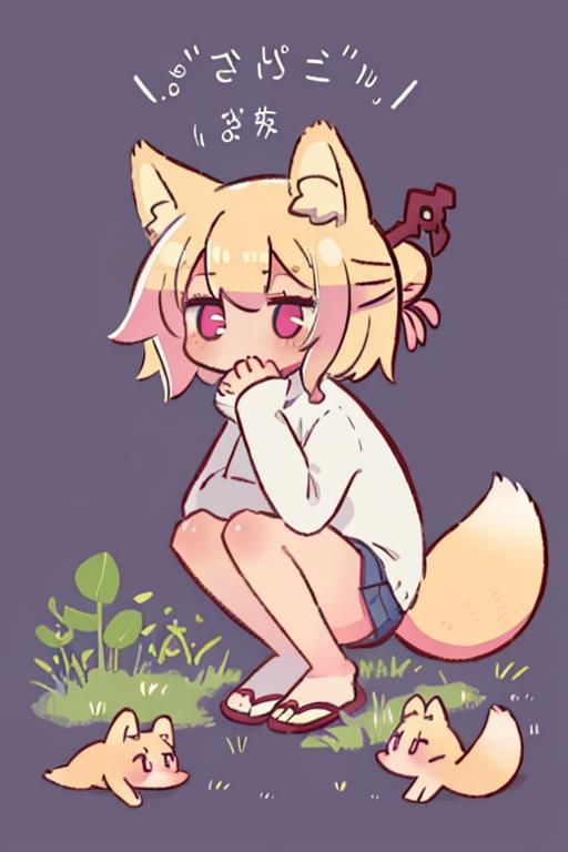 Target Components: kemomimi — head + eyes, fox ears — fox-like ears, blonde hair — character's hair color, hair between eyes — character's hairstyle, single hair bun — character's head accessory, fox tail — character's tail, personating — personification, objectification — personification (stable), animalization—animalization
