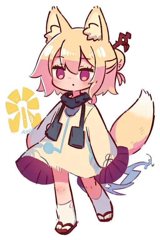 标的成分:kemomimi——头部+眼睛。。。fox ears——狐狸耳朵。。。blonde hair——角色发色。。。hair between eyes——角色发型。。。single hair bun——角色头饰。。。fox tail——角色尾巴。。。personating——拟人化。。。objectification——拟人化(稳定)
