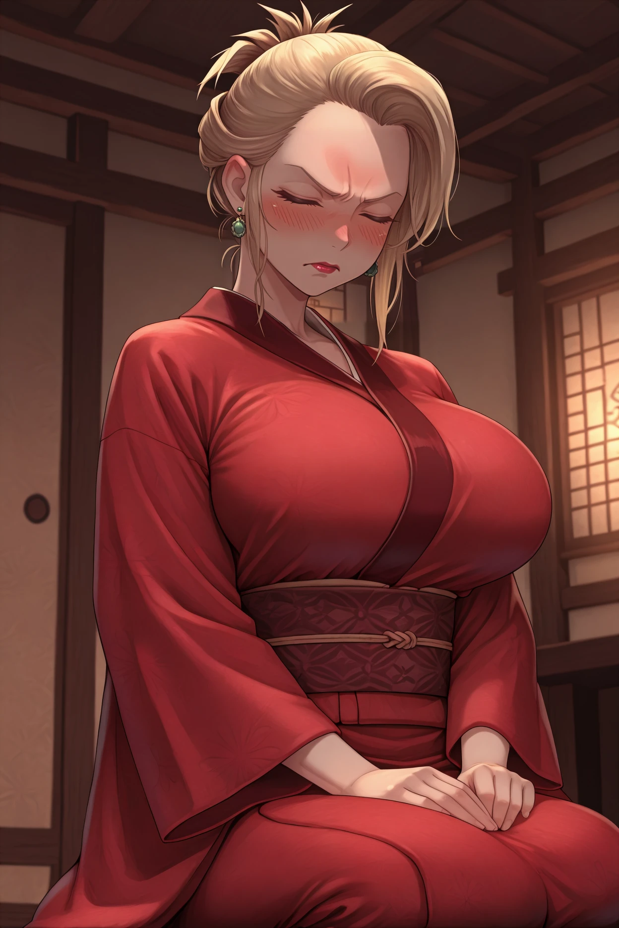Trigger word is "ffSc4rlet" and "blonde hair, folded ponytail, short hair, blue eyes, lipstick" is required.