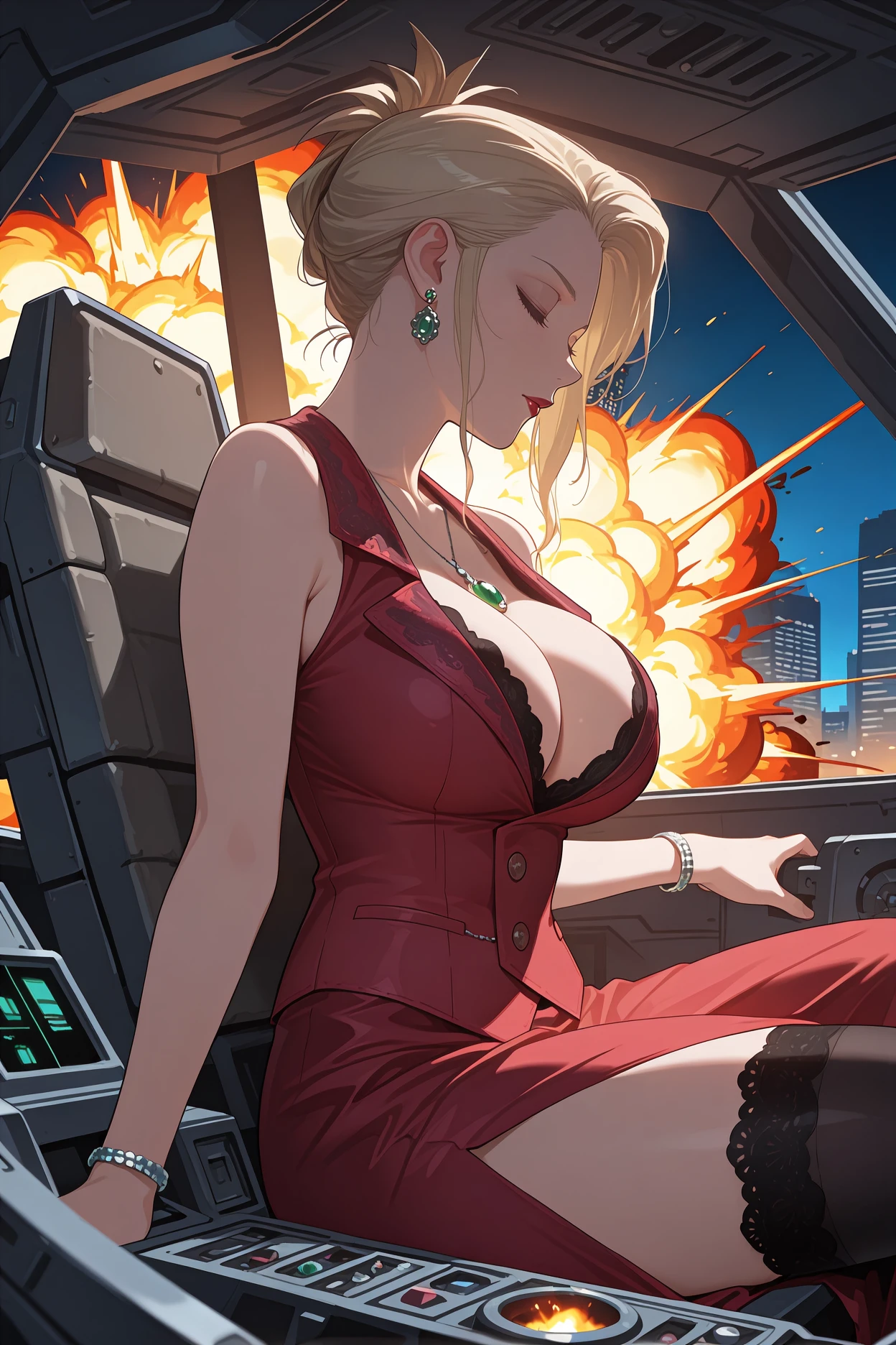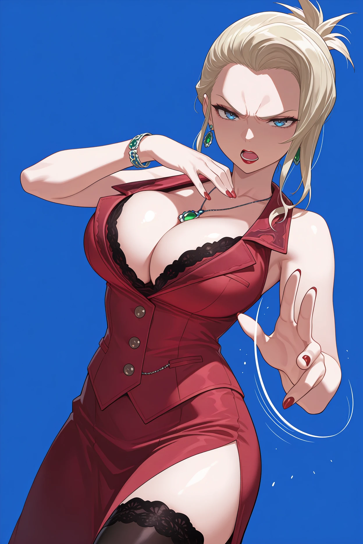 Add "green earrings, green pendant, red vest, sleeveless, lace trim, cleavage, bracelet, red skirt, long skirt, side slit, lace-trimmed legwear, black thighhighs, red high heels, red nails" for her typical look.