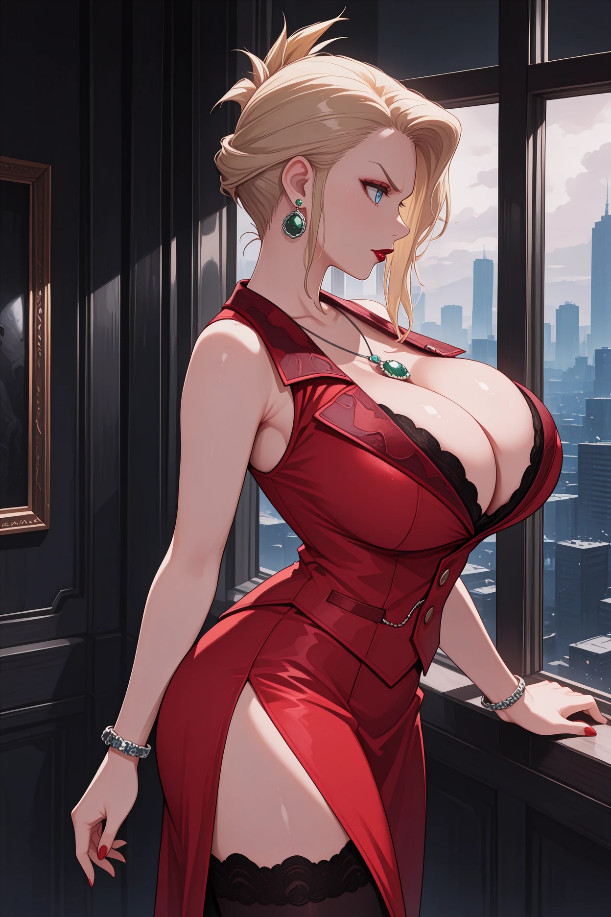 Add "green necklace, red dress, lace trim, sleeveless dress, long dress, cleavage, bracelet, black thighhighs, lace trim" for her typical look.