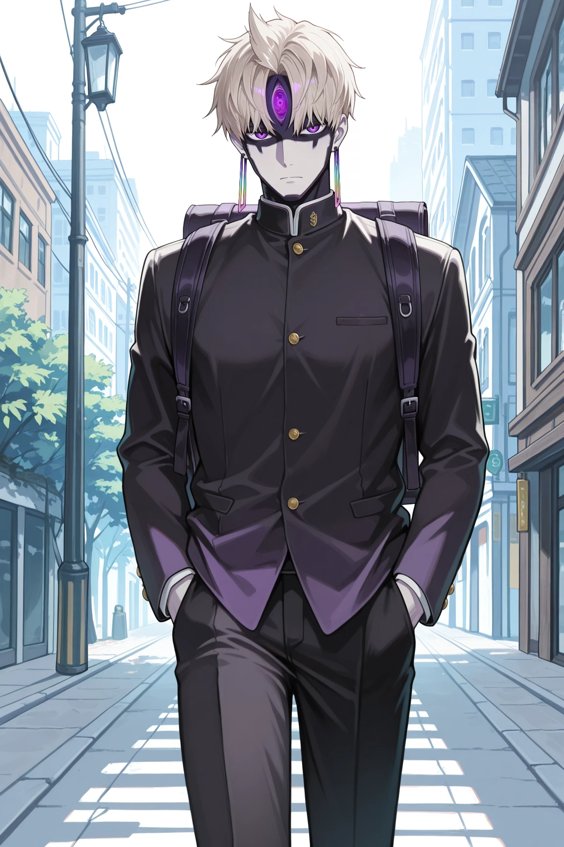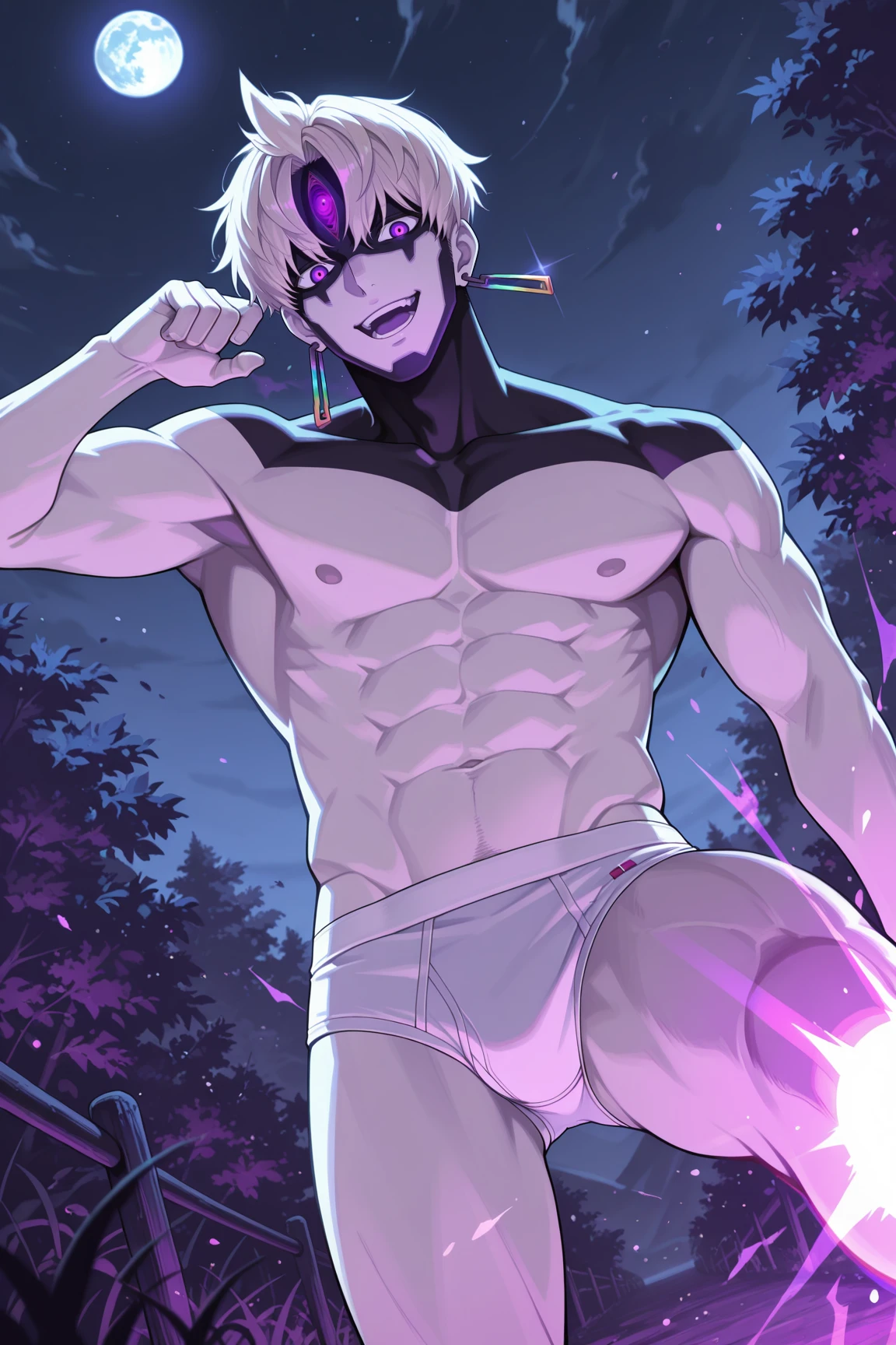 evileye, evil_eye_yokai, platinum blonde hair, purple eyes, iridescent earrings, facial mark, pale skin, forehead symbol, black neck and shoulder tattooBase Prompt (V2):