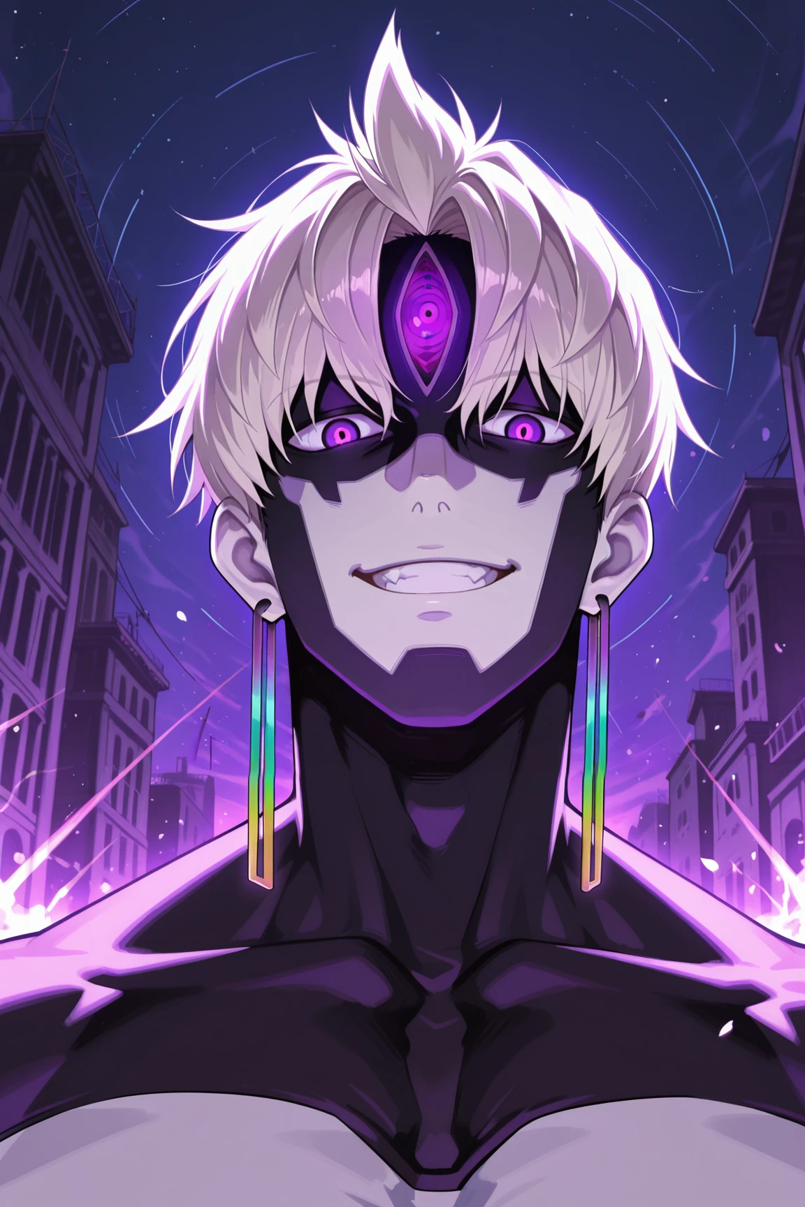 Evil Eye, evil eye (dandadan), platinum blonde hair, purple eyes, iridescent earrings, facial mark, pale skin, third eye, black tattoo