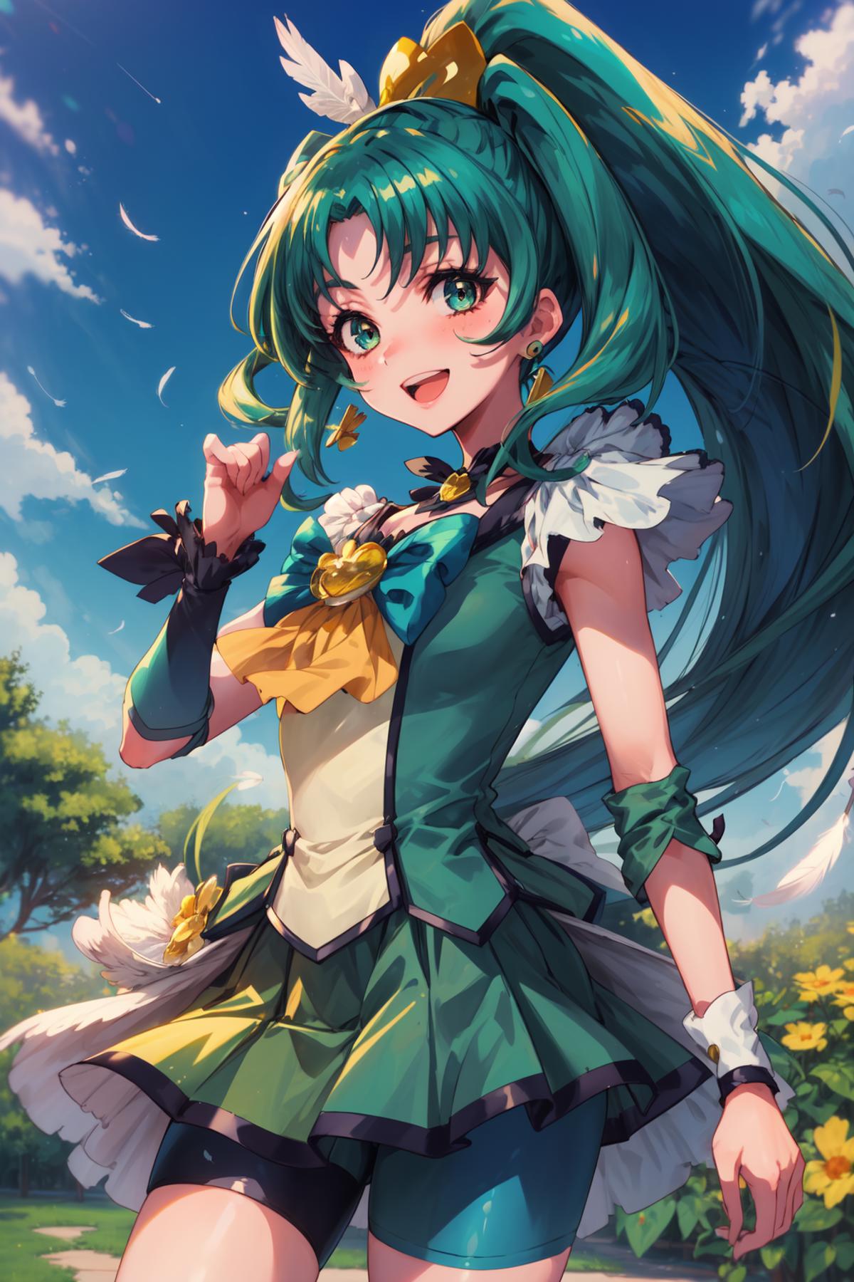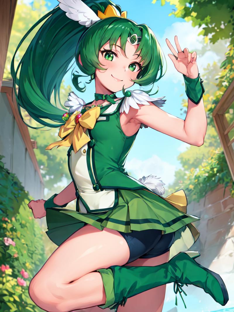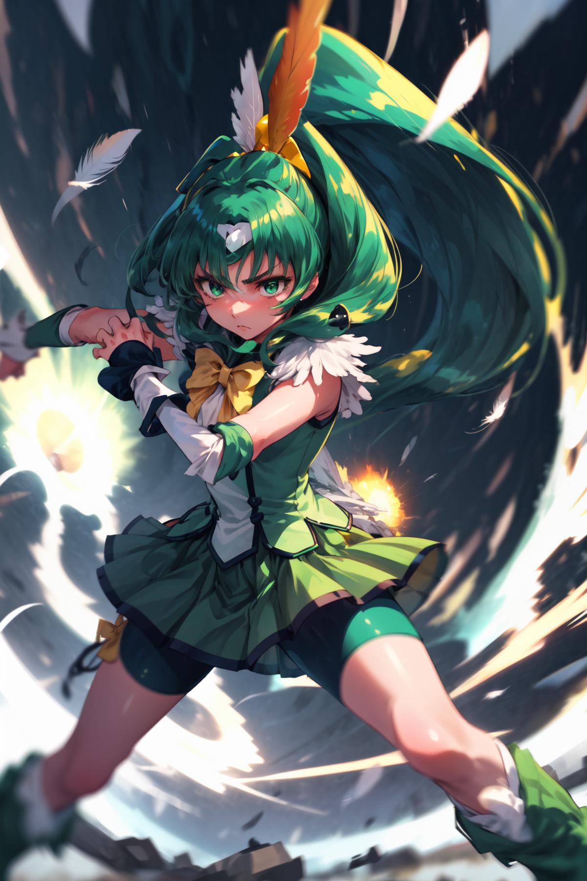 Recommend Tags: bowtie, high ponytail, arm warmers, feather hair ornament, green boots, shorts under skirt, green shorts