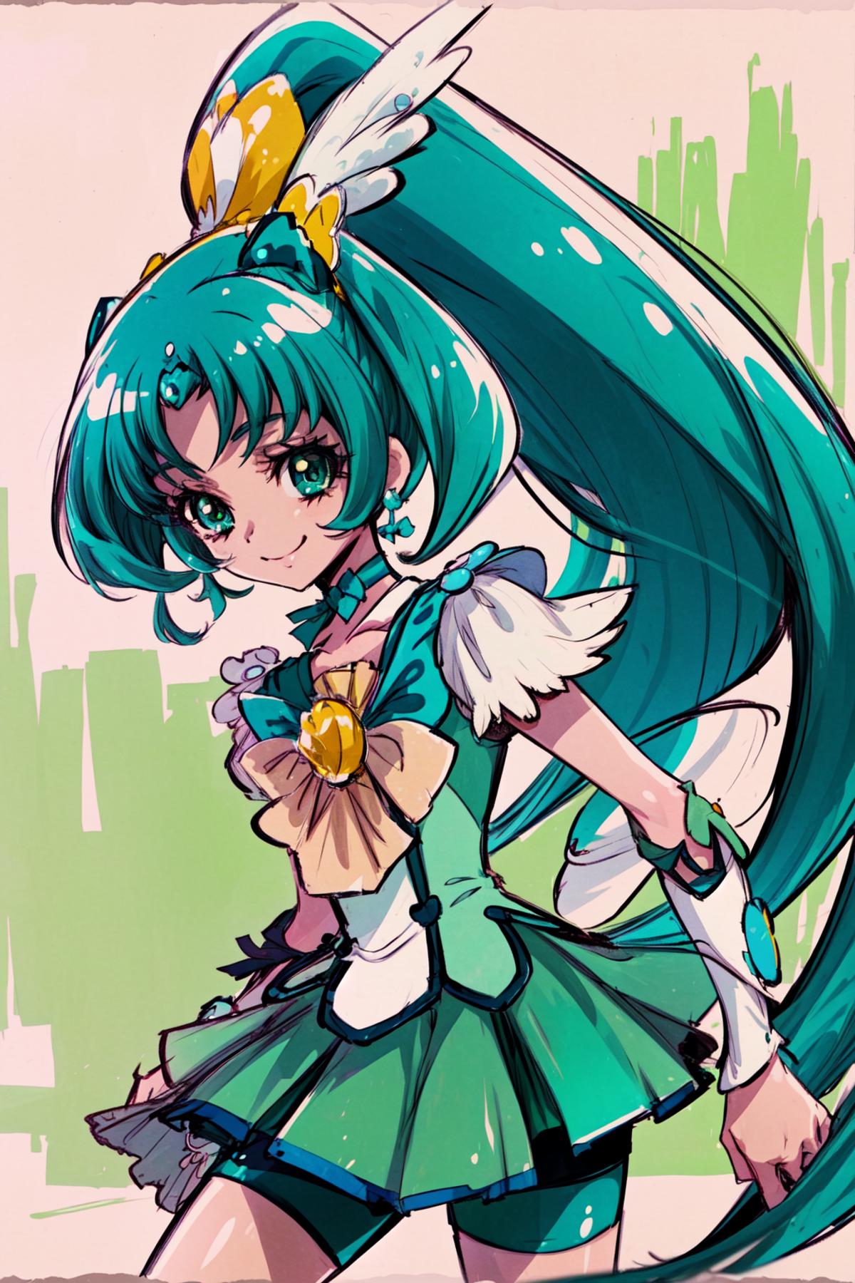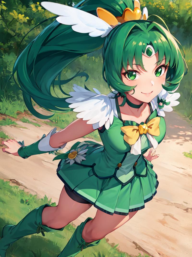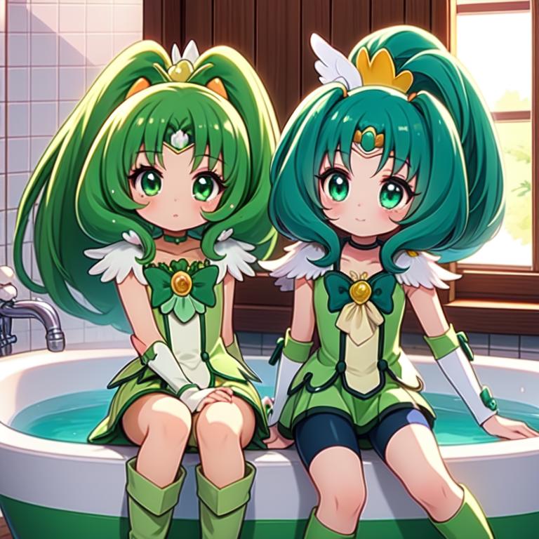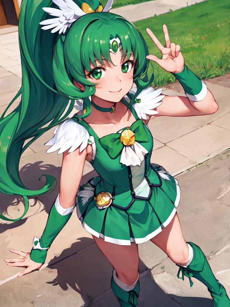 Recommend Tags: bowtie, high ponytail, arm warmers, feather hair ornament, green boots, shorts under skirt, green shorts