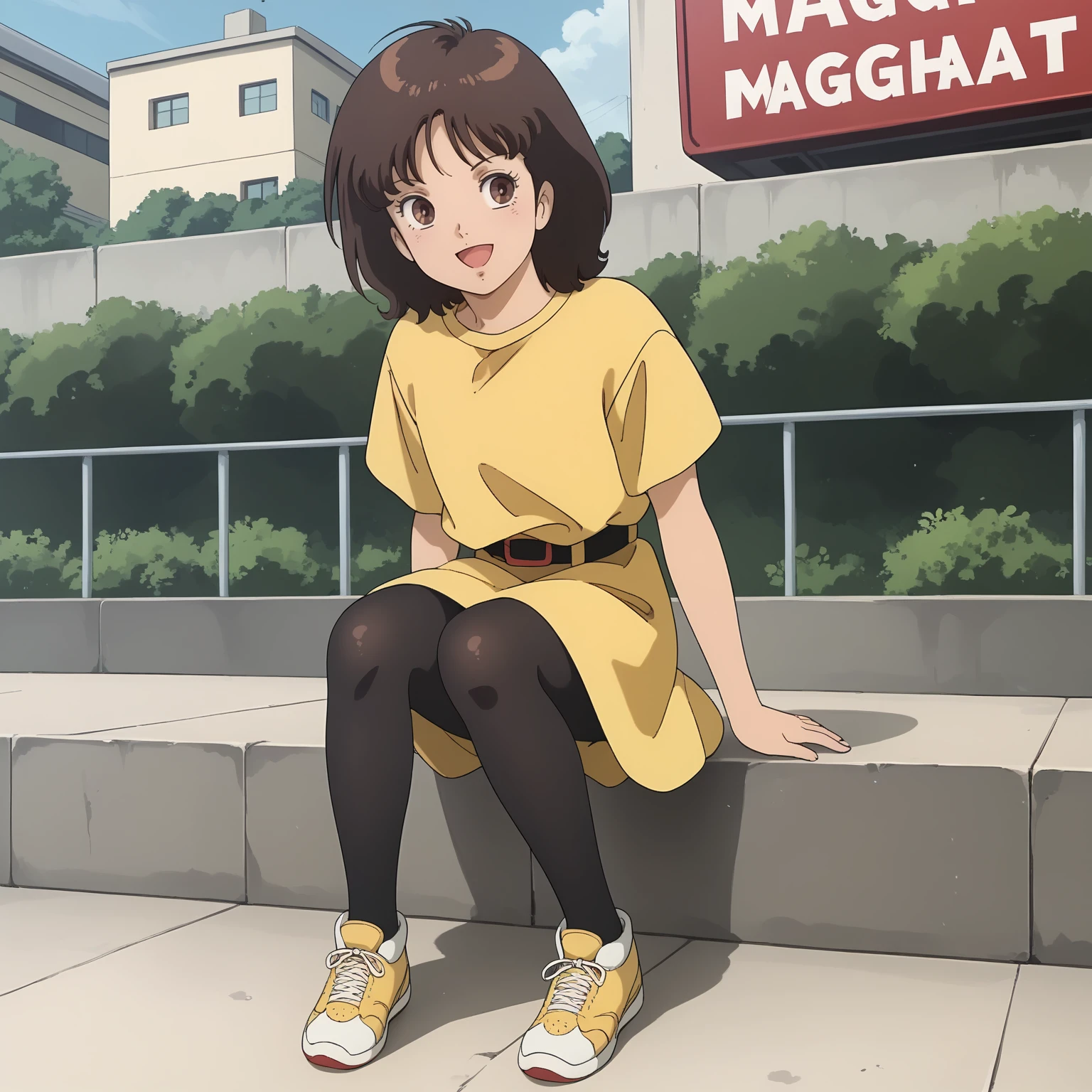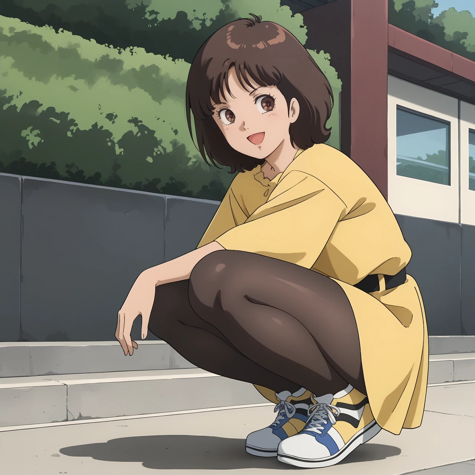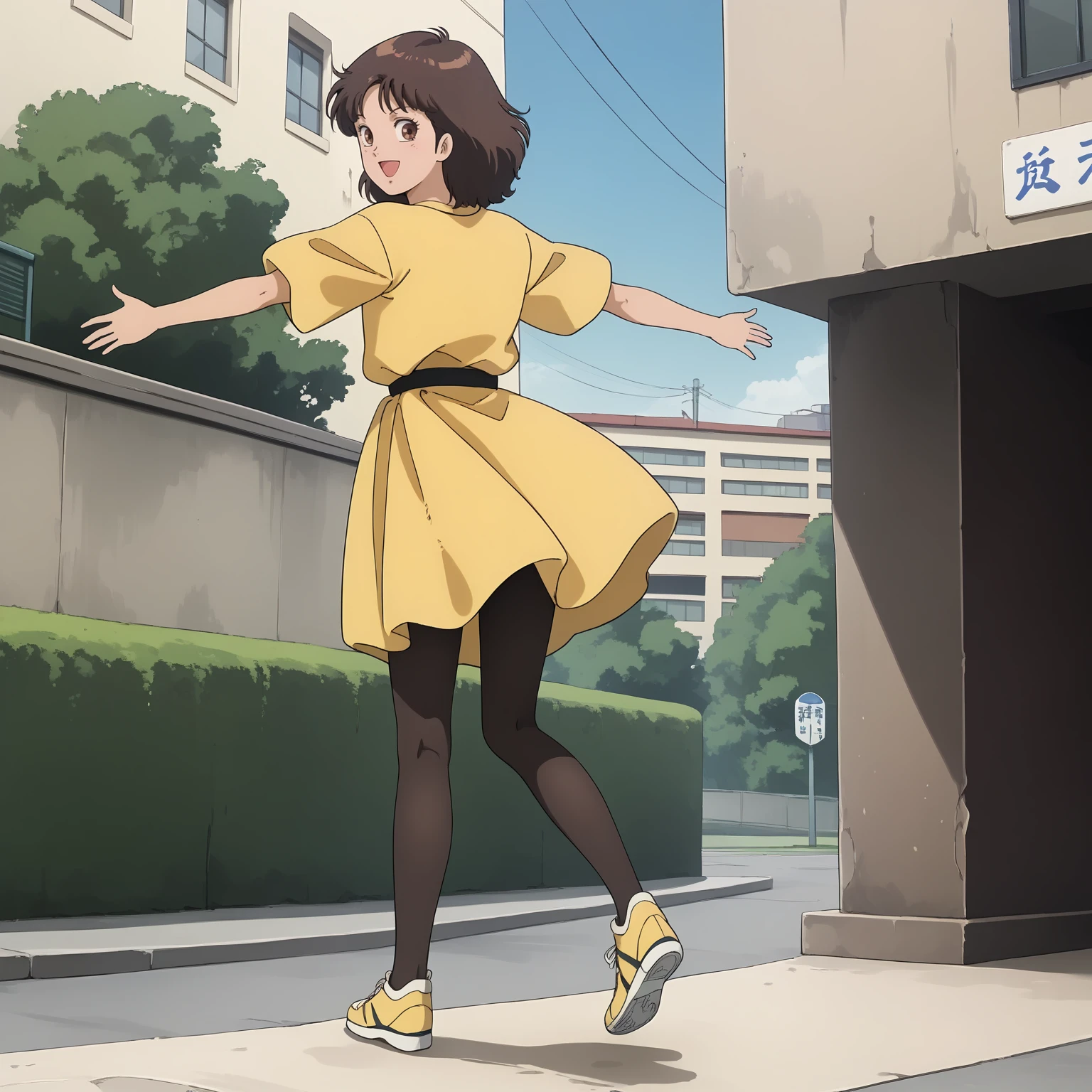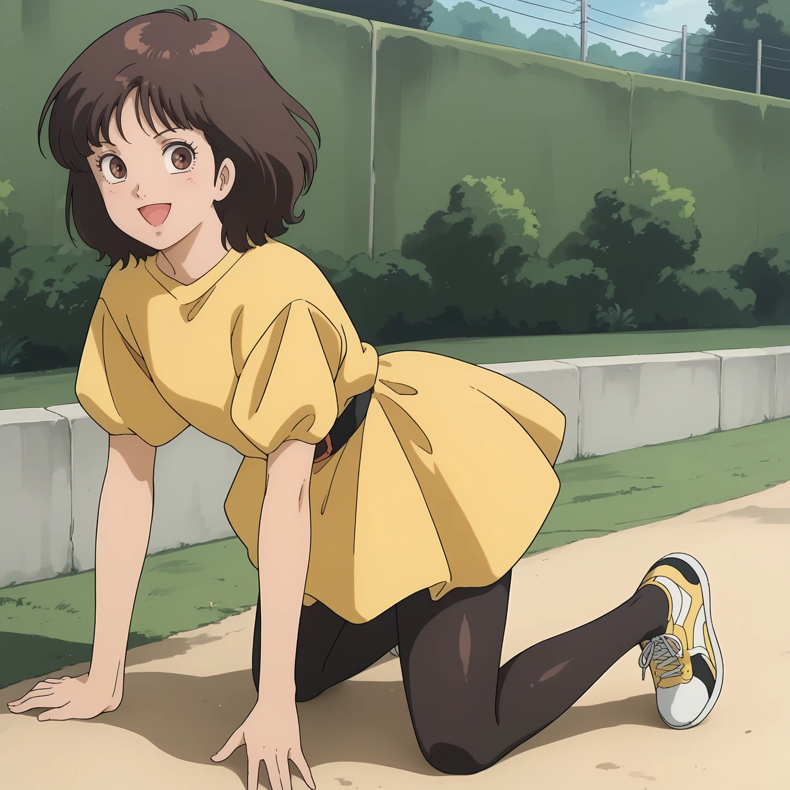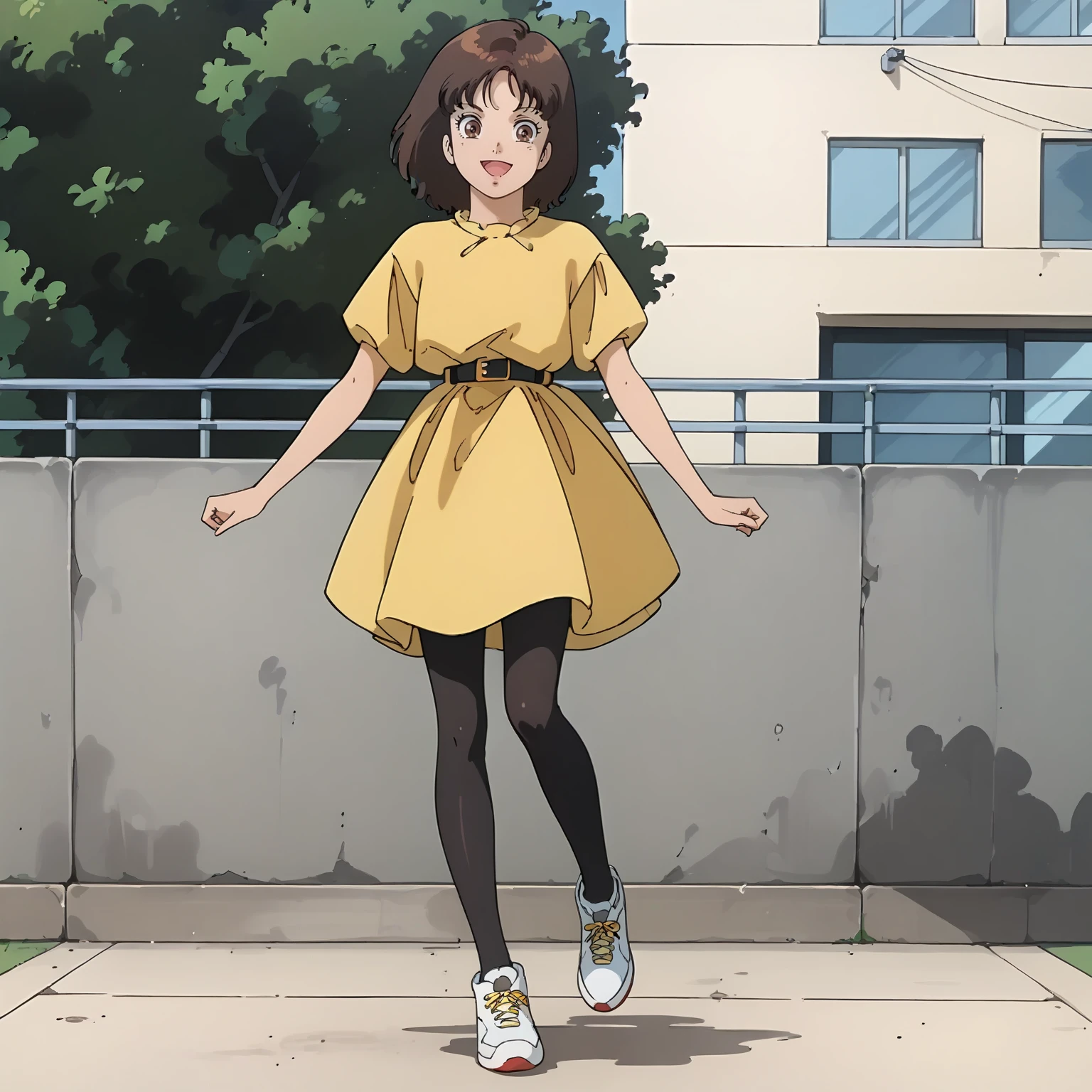 yellow dress, black belt,miniskirt, black_pantyhose, sneakers,