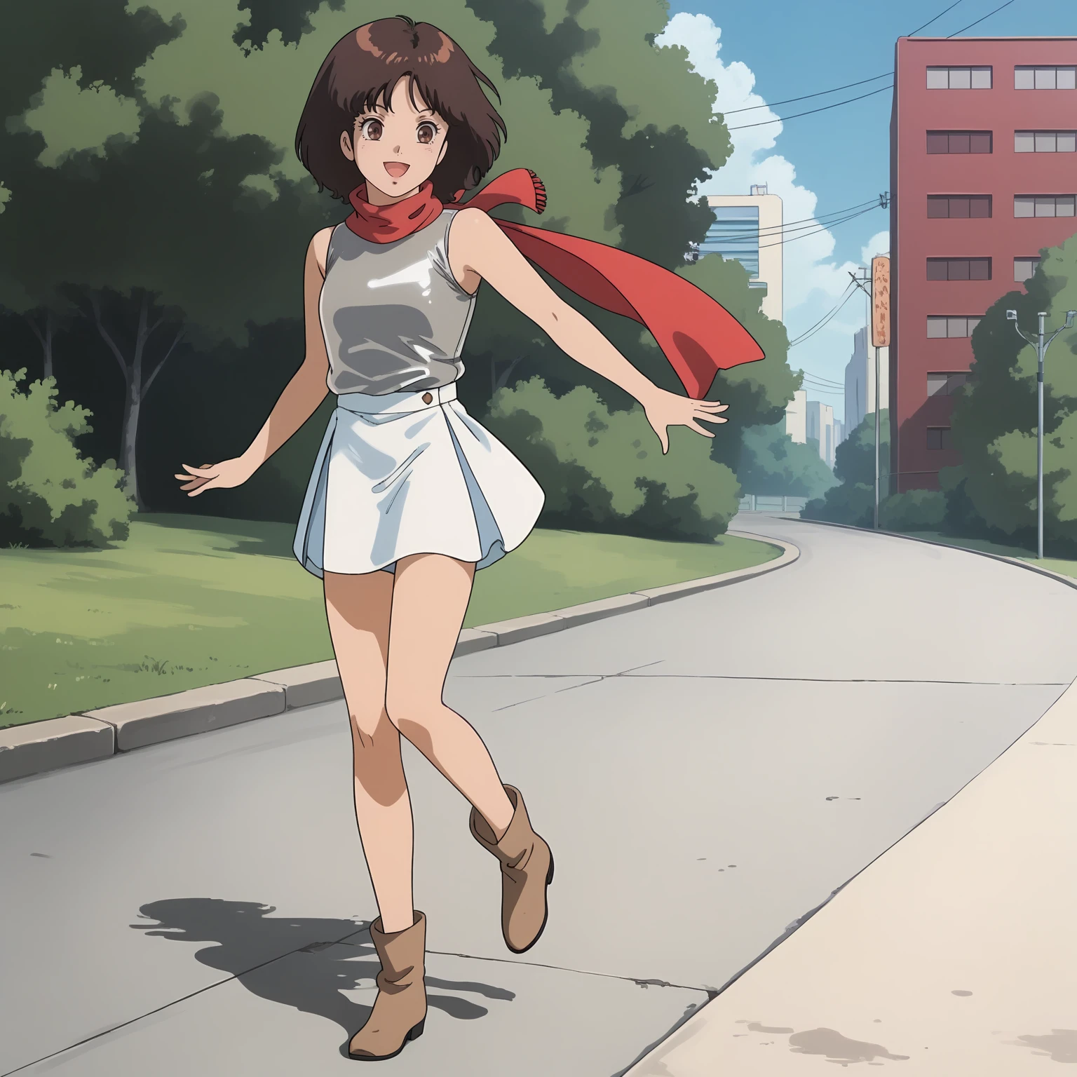 short red scarf, silver latex shirt,sleeveless, white skirt,miniskirt,pencil_skirt, short boots,