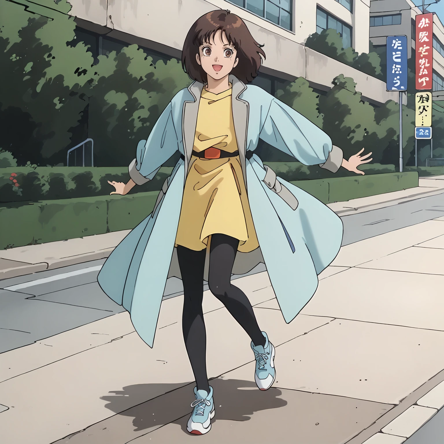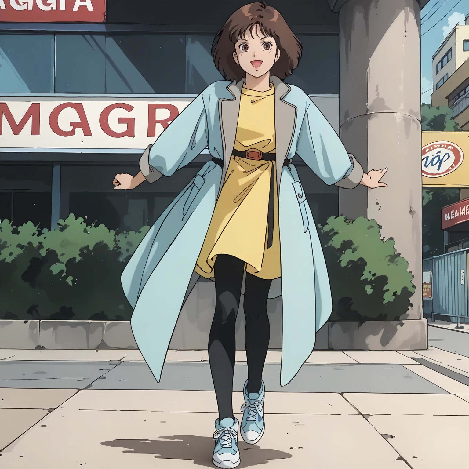 light blue coat,yellow dress, black belt,miniskirt, black_pantyhose, sneakers,