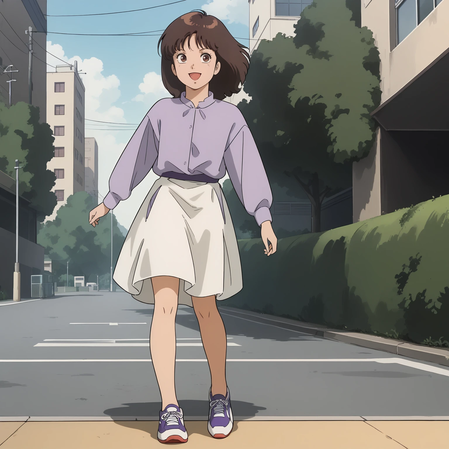 purple dress shirt,long_sleeves, white skirt,miniskirt,pencil_skirt, sneakers,
