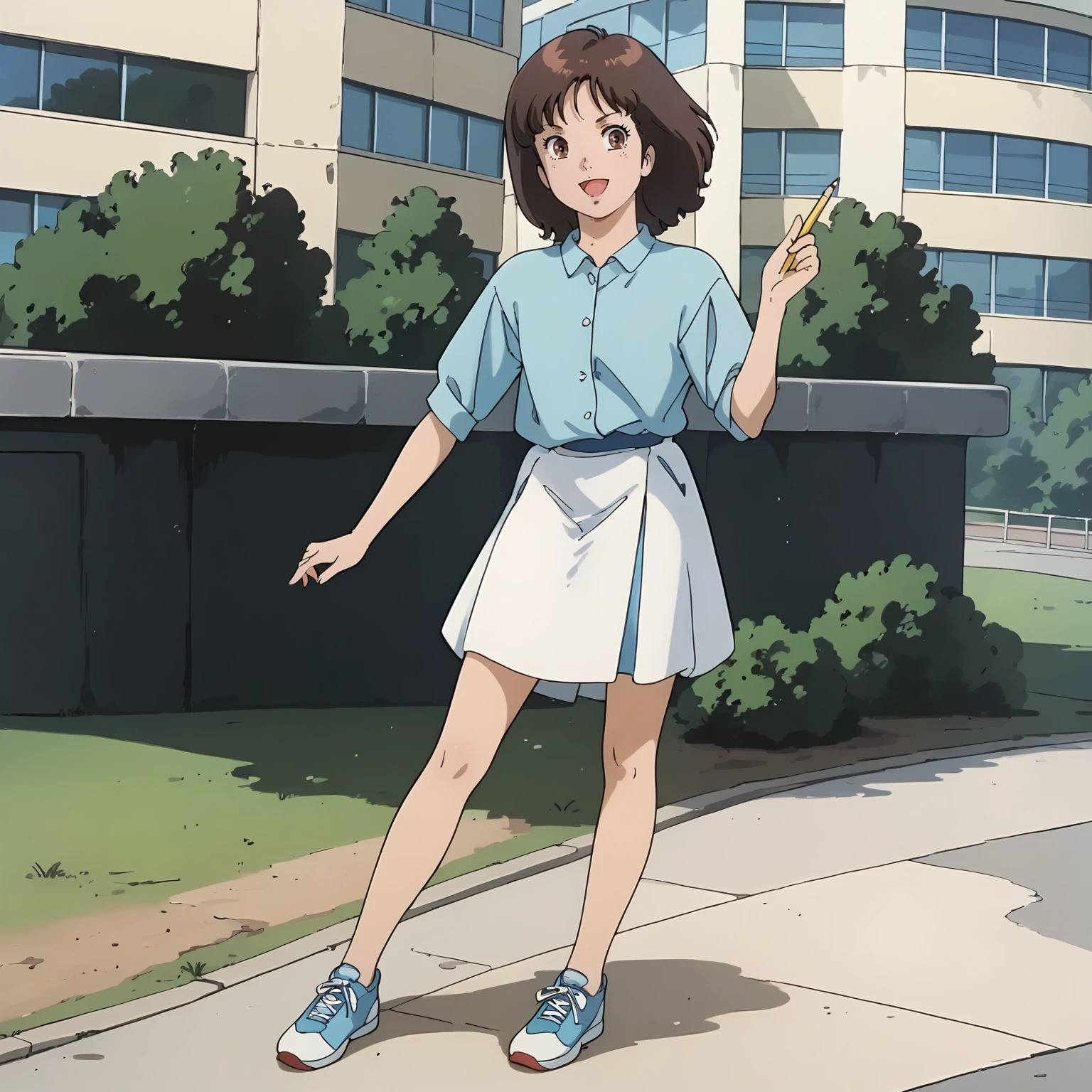 blue dress shirt, white skirt,pencil_skirt,sneakers,