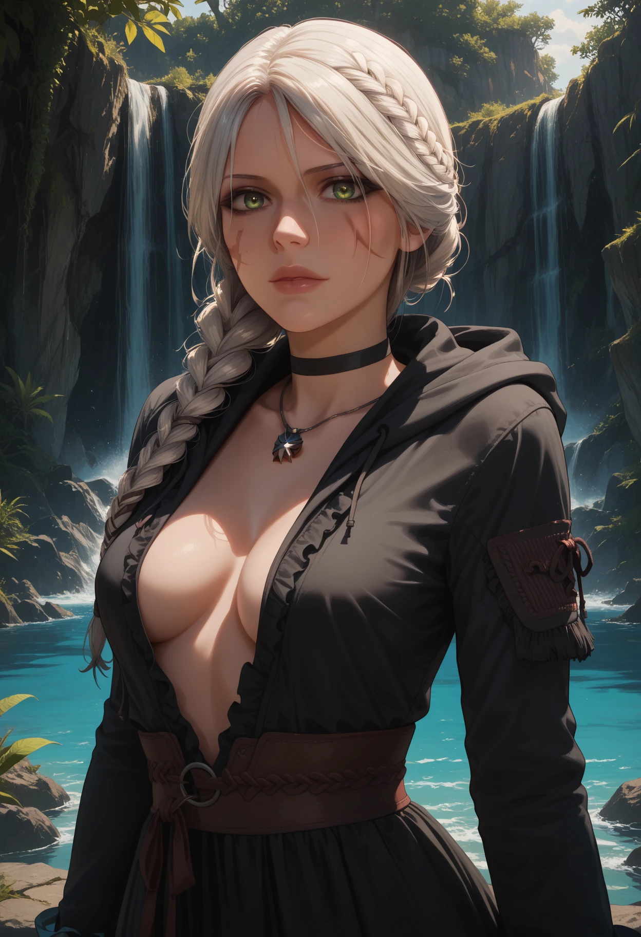 recommended tags: 1girl, solo, green eyes, yellow eyes, white hair, long hair, hair over shoulder, braid, single braid, hair ornament, scar, scar on face, scar across eye, lips, closed mouth, slim waist, breasts, medium breasts,