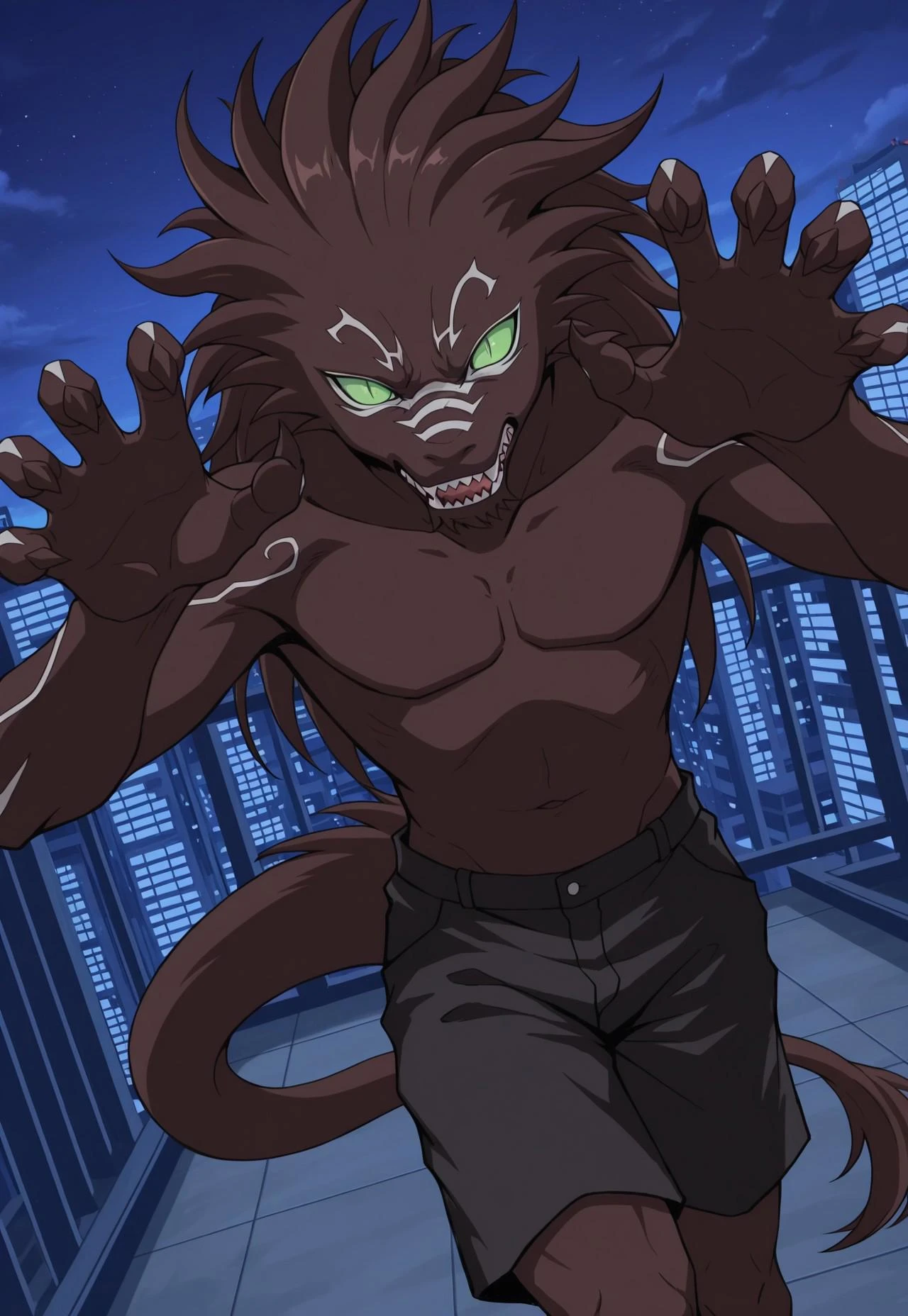 ygenshishio, furry male, solo, dark skin, long hair, green eyes, slit pupils, sharp teeth, brown claws, shorts, tail