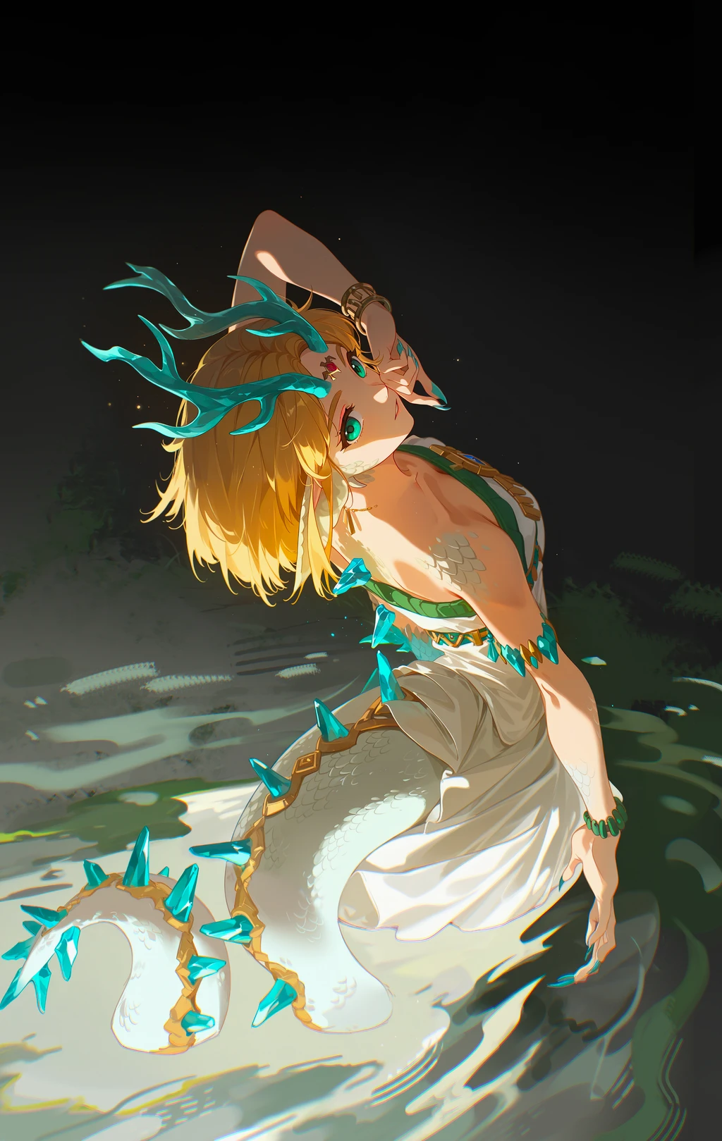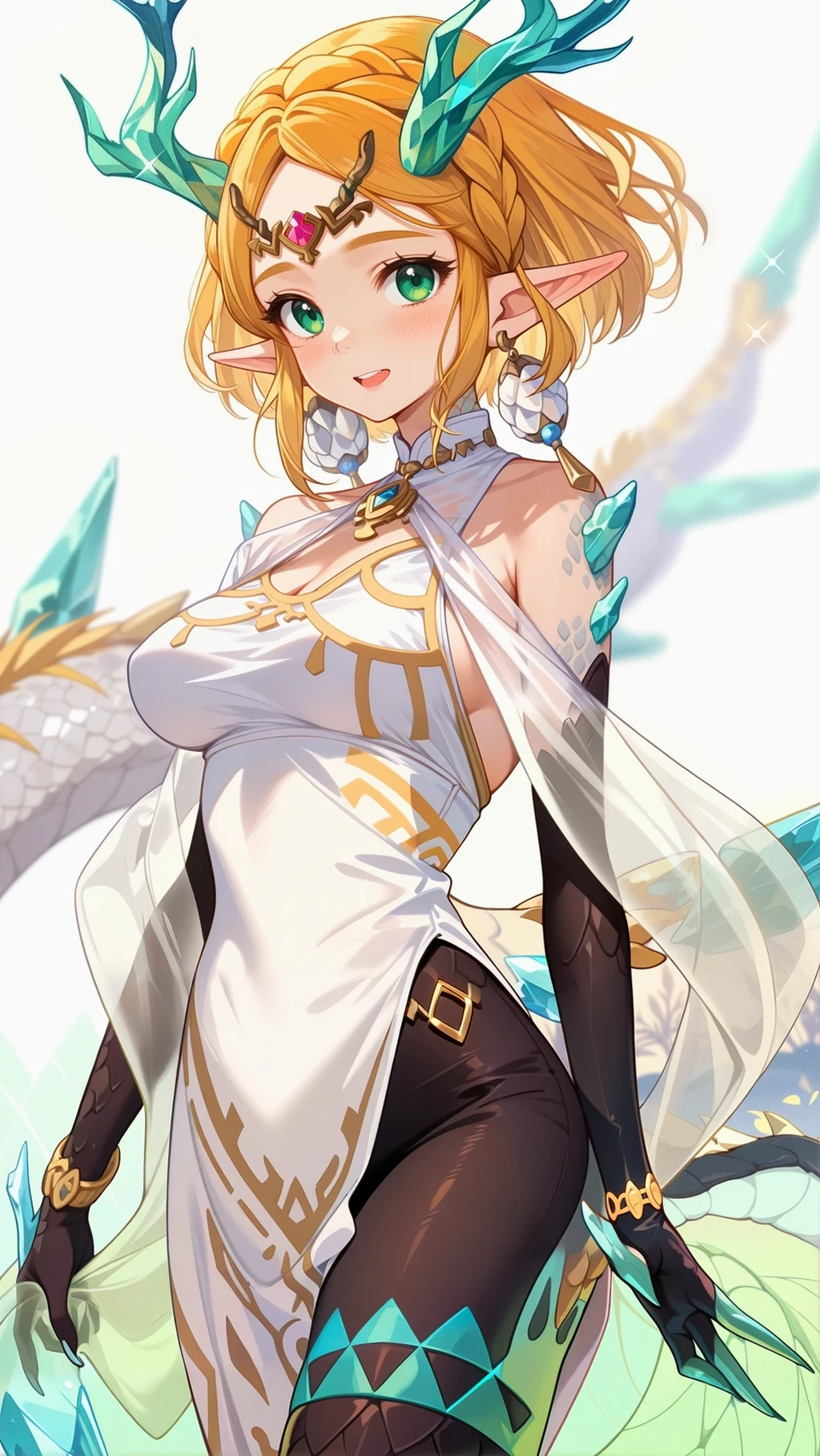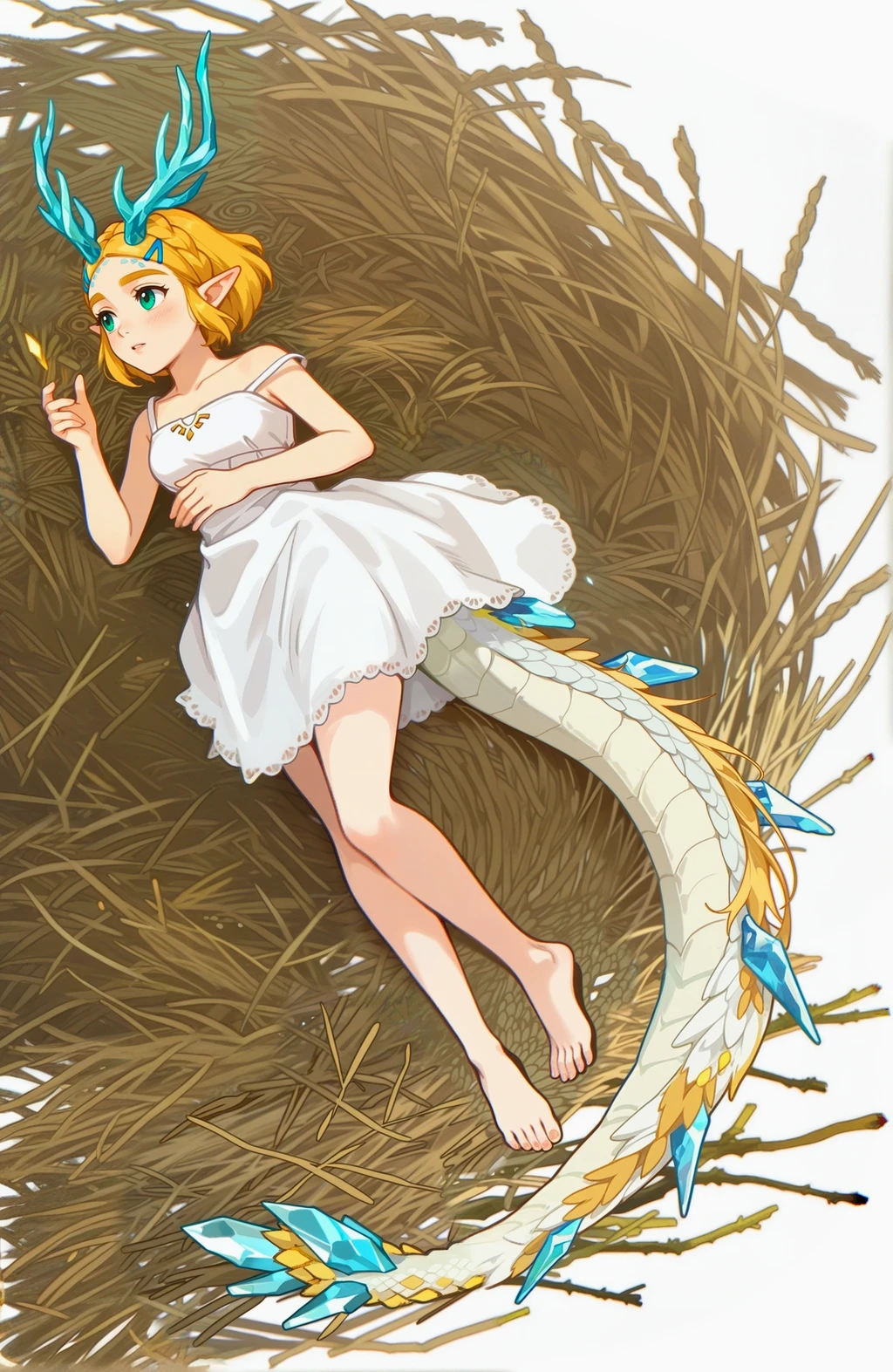 (Positive Prompts) lyndrgzdla, monster girl, dragon girl, dragon tail, dragon horns, princess zelda, claws, scales,