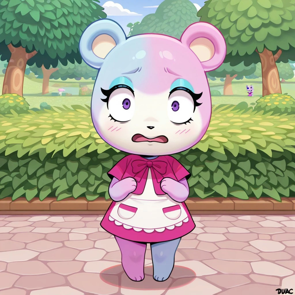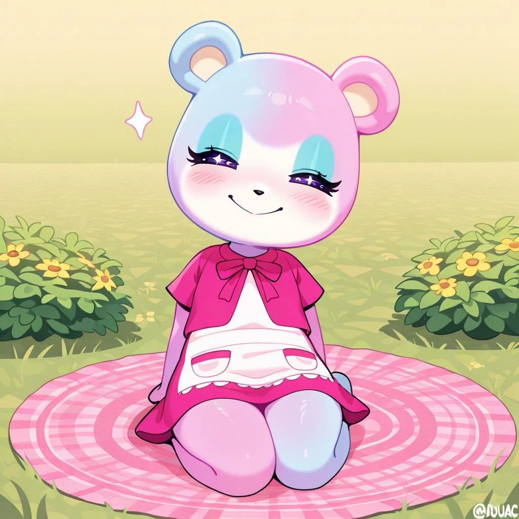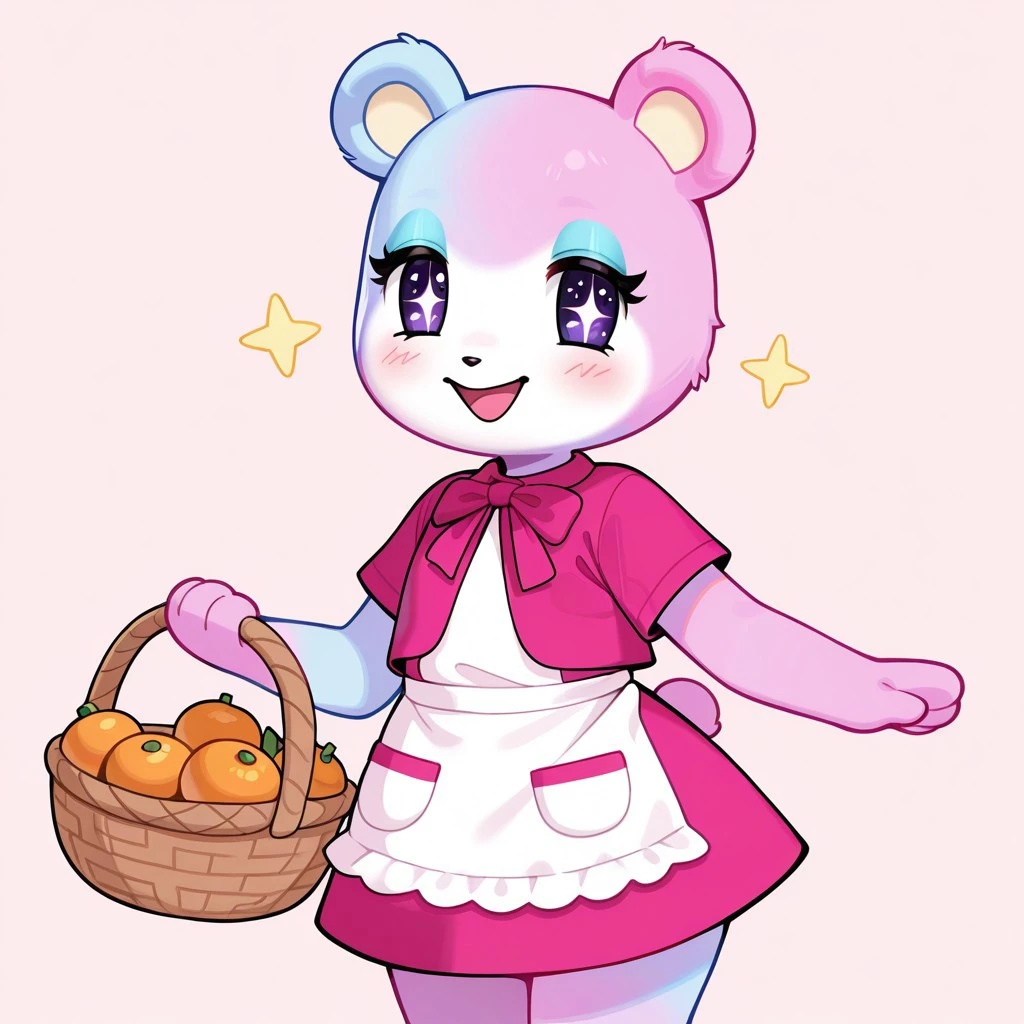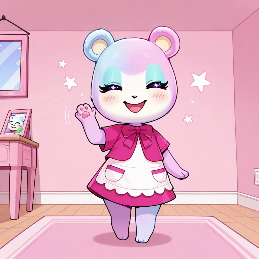 judyac, animal crossing, 1girl, solo, furry, bear, two-tone fur, light pink fur, light blue fur, white muzzle, purple eyes, star pupil, blush, blue eyeshadow, pink dress