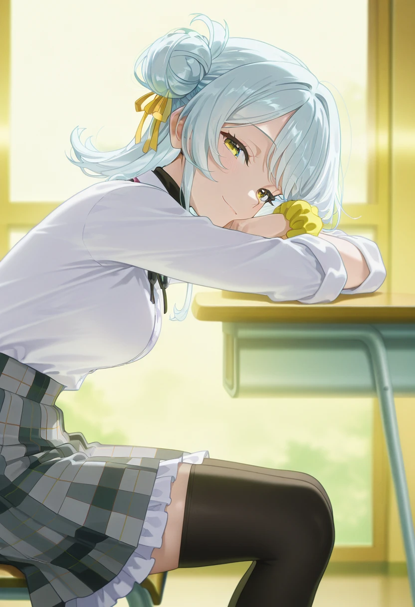 Tags for her outfit: long sleeves, school uniform, white shirt, pleated skirt, frills, collared shirt, black thighhighs, black shirt, dress shirt, turtleneck, frilled skirt, grey skirt, shirt tucked in, wrist scrunchie, checkered skirt, sleeves pushed up, yellow scrunchie,