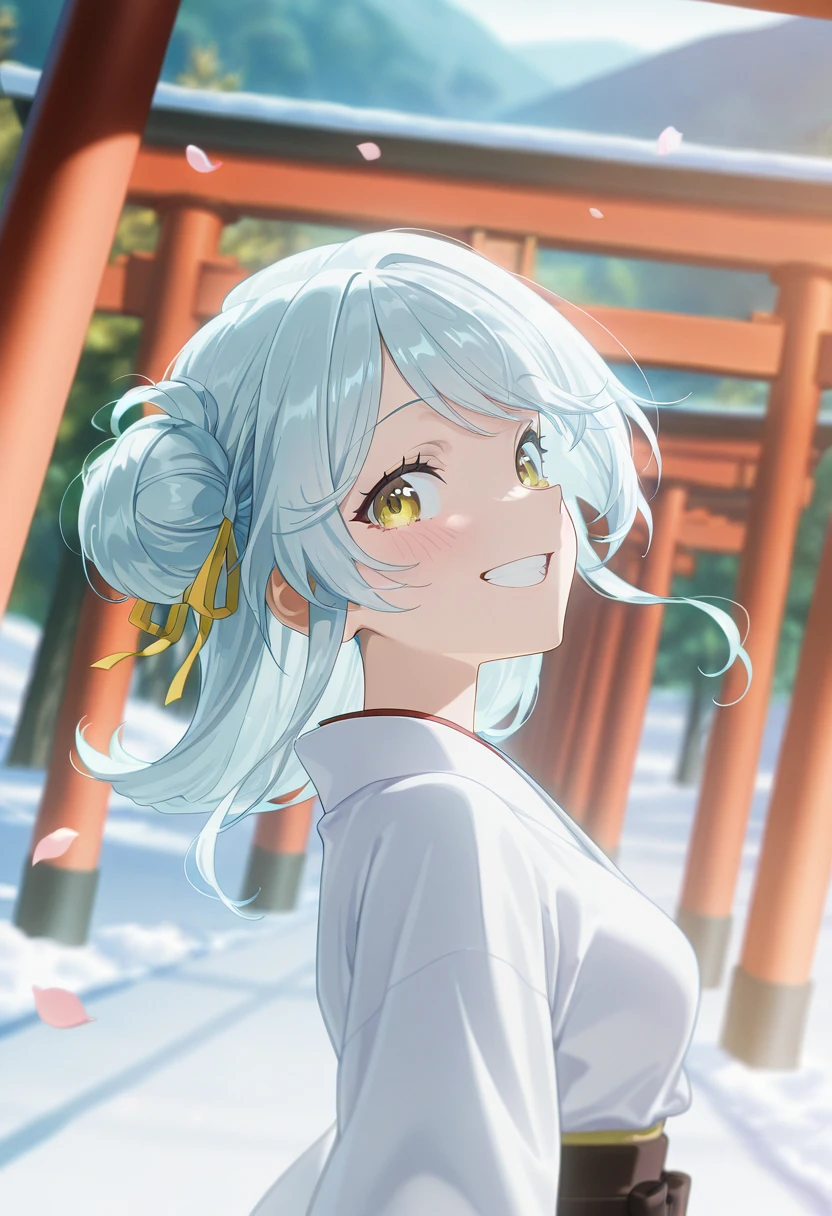 1girl, solo, medium breasts, yellow eyes, hair ribbon, sidelocks, swept bangs, single hair bun, yellow ribbon, single side bun, medium hair, light blue hair,