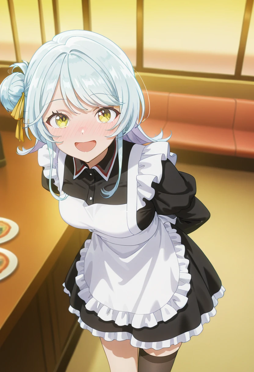 Tags for her look: 1girl, solo, medium breasts, yellow eyes, hair ribbon, sidelocks, swept bangs, single hair bun, yellow ribbon, single side bun, medium hair, light blue hair,