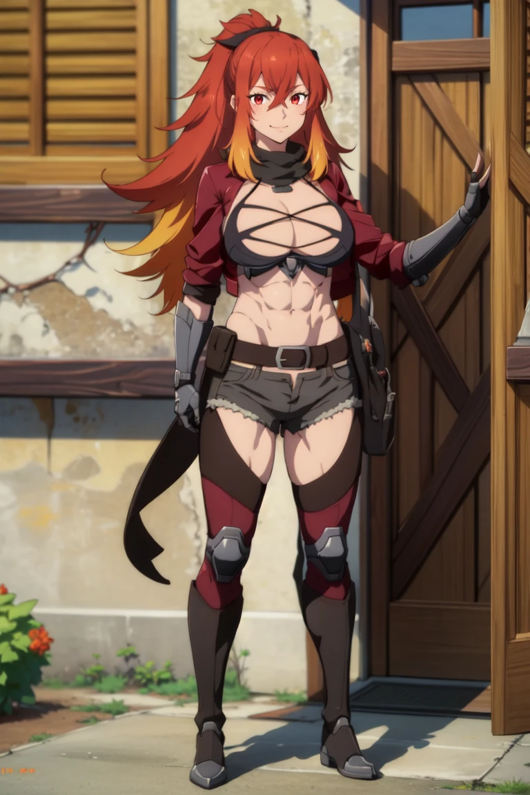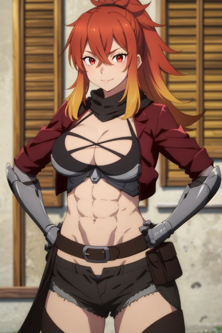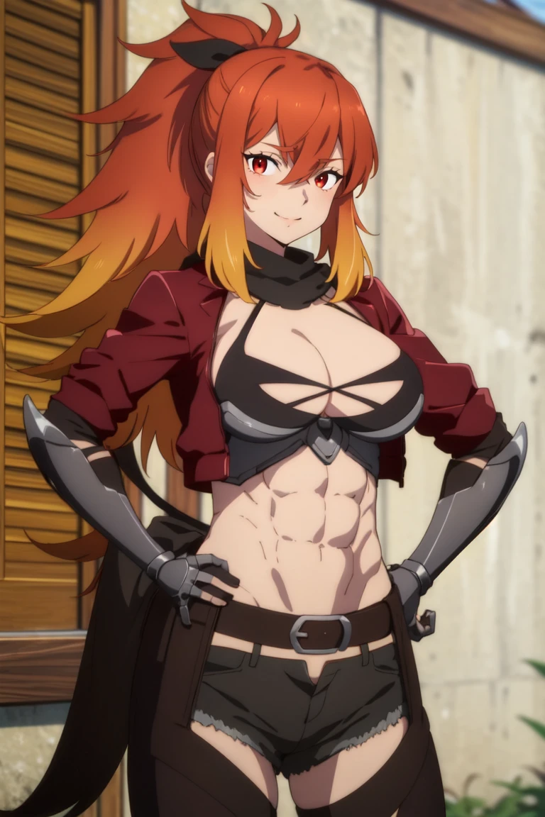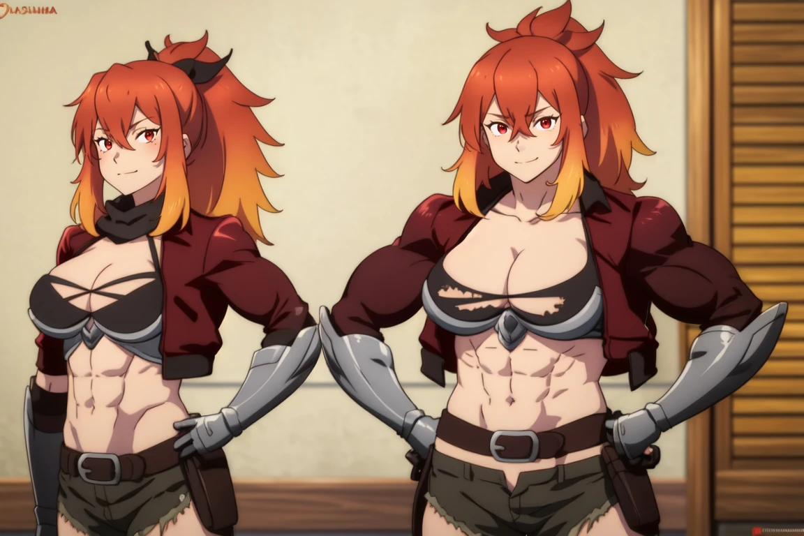 red eyes , orange eyes , multicolored hair , red hair , orange hair , ponytail , abs , navel , large breasts