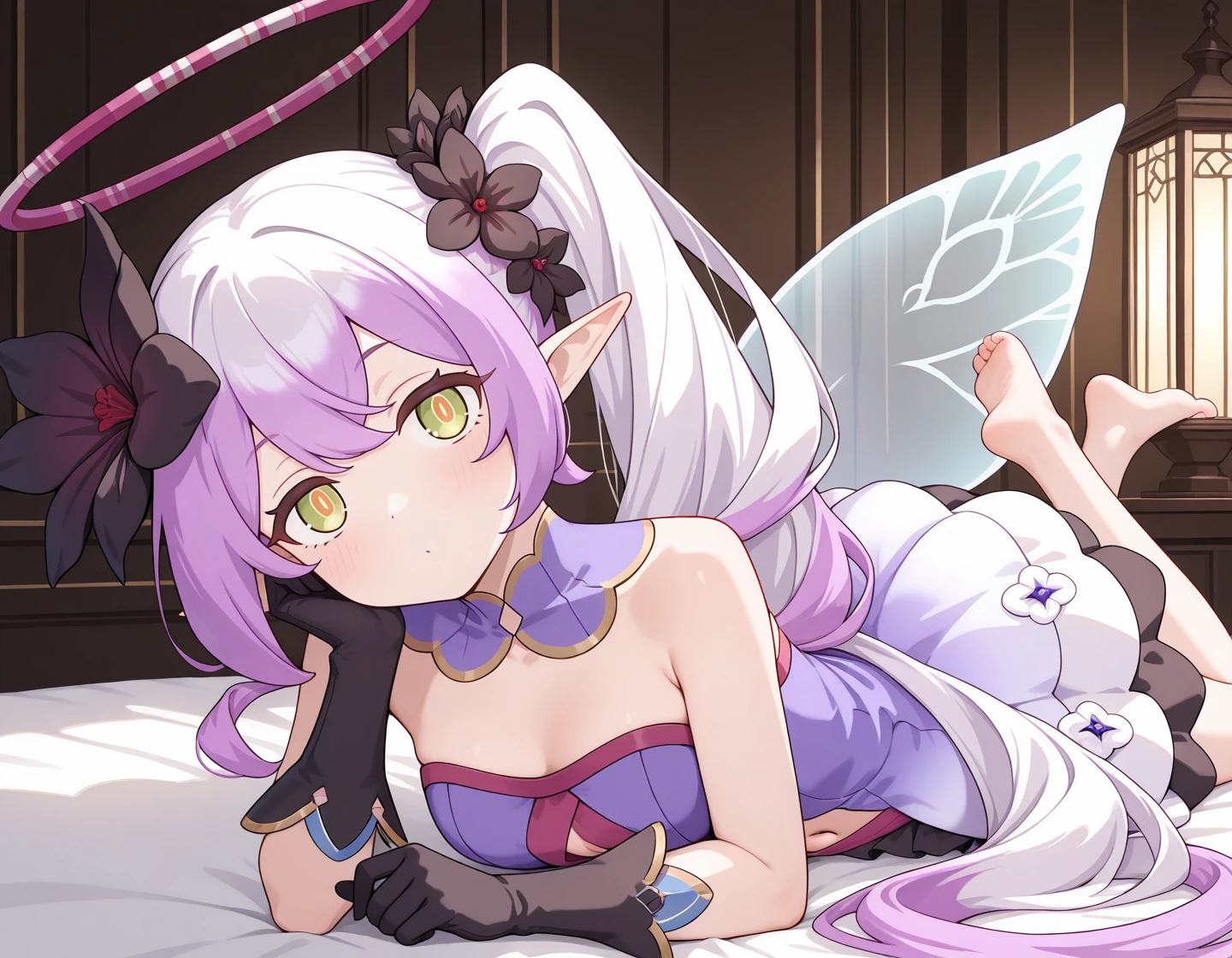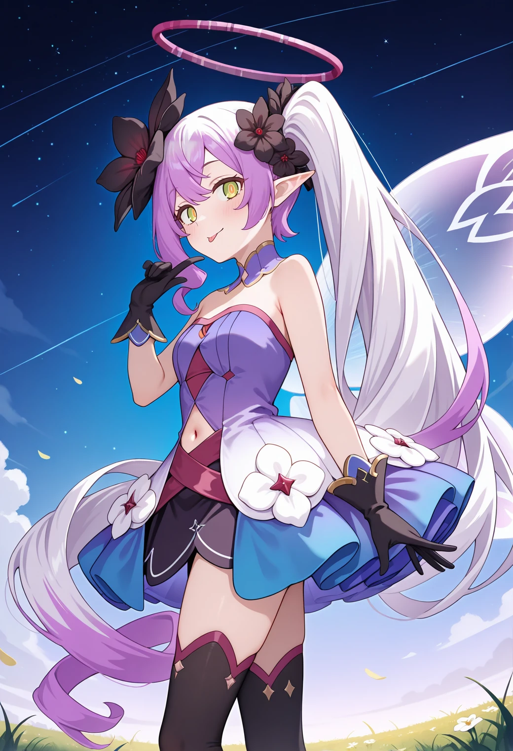 pcrtia, pointy ears, very long hair, side ponytail, purple hair, multicolored hair, hair flower, halo, green eyes, orange pupils,