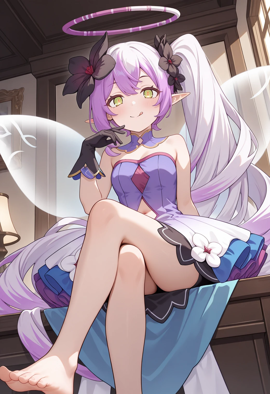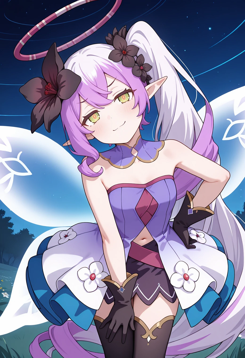 tiapcdef, pointy ears, very long hair, side ponytail, purple hair, multicolored hair, hair flower, halo, green eyes, orange pupils, detached collar, gradient dress, purple dress, strapless dress, layered dress, cleavage, navel cutout, black gloves, black skirt, flower ornament, black thighhighs, fairy wings,