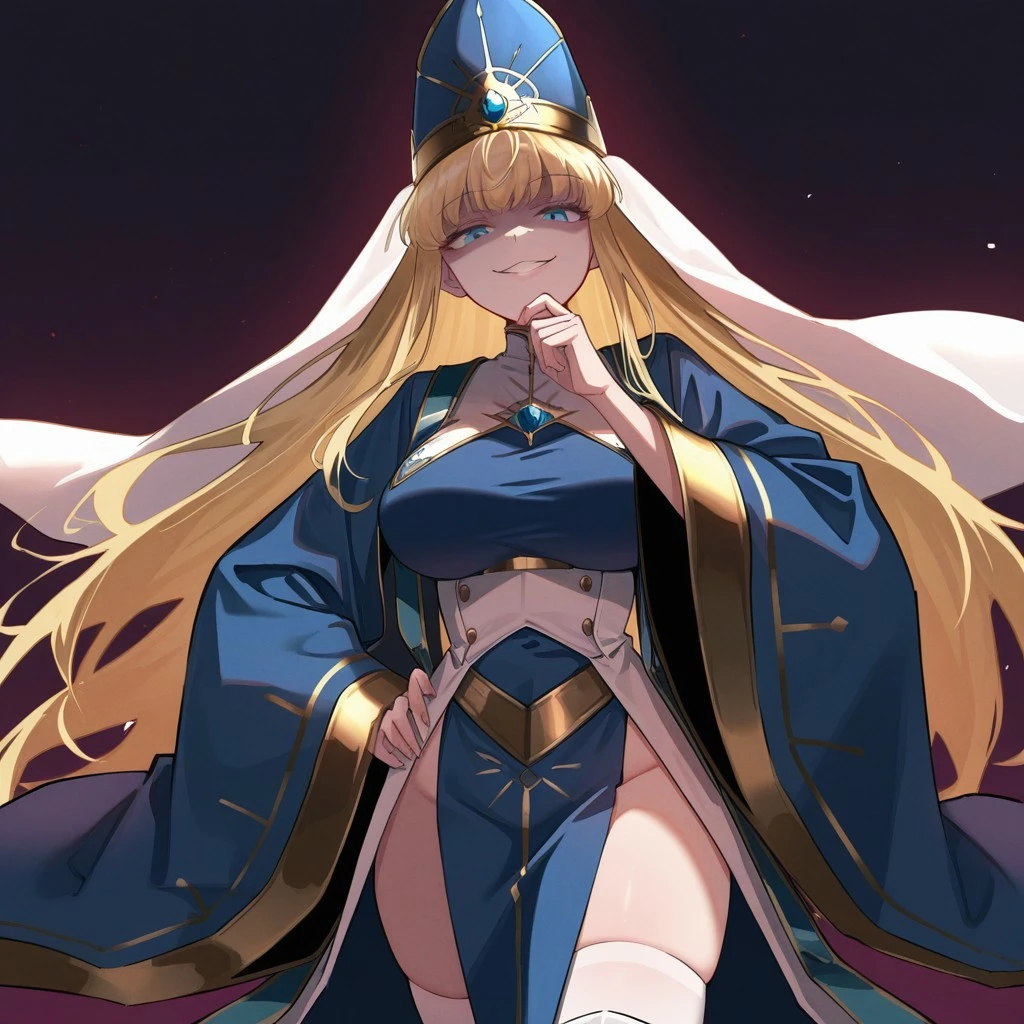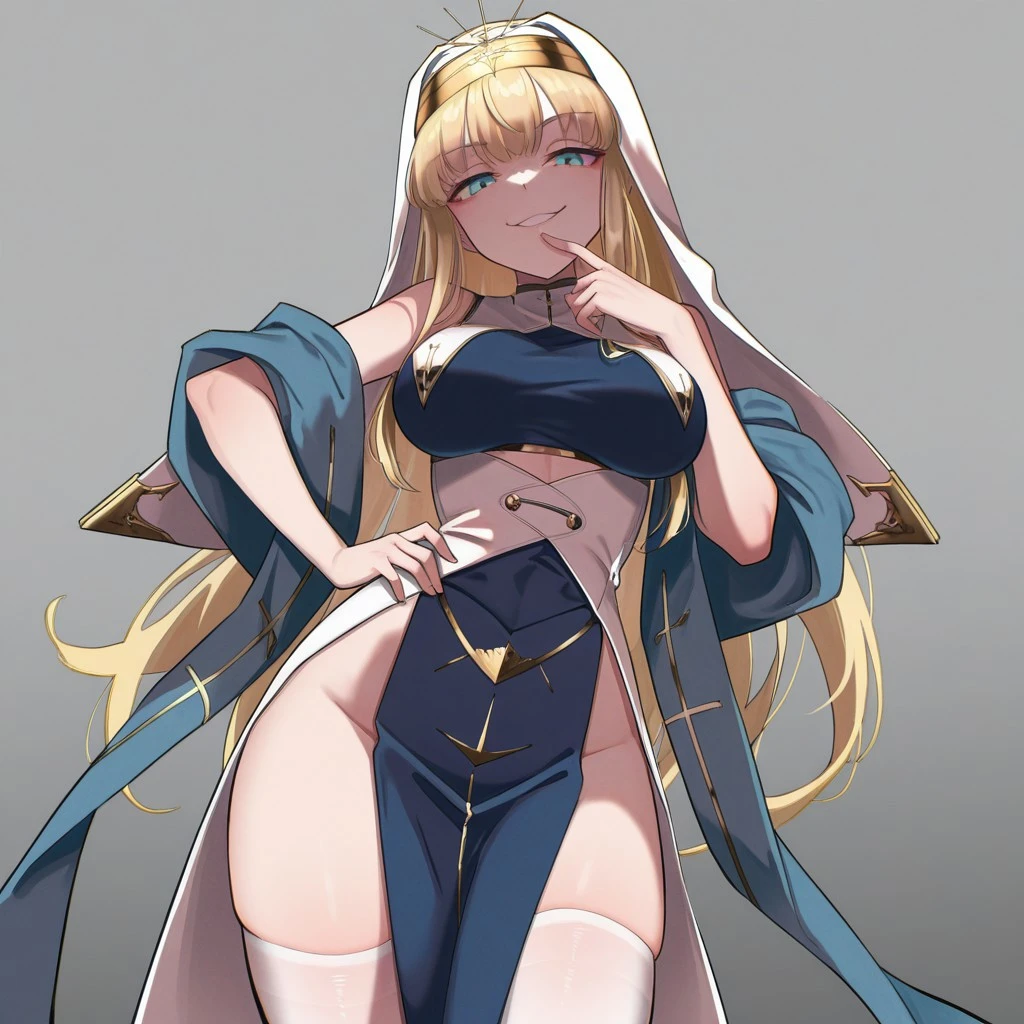 Outfit: white collar, blue top, sleevless top, blue pelvic curtain, white waist cape, golden ornaments, white thigh boots, golden heels