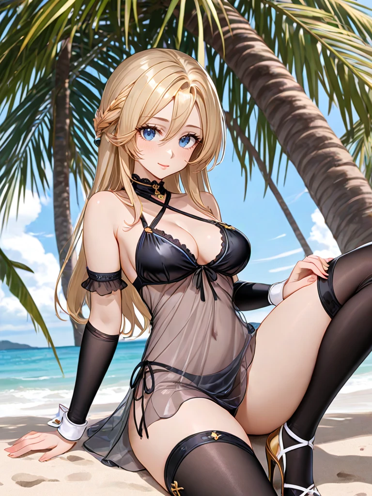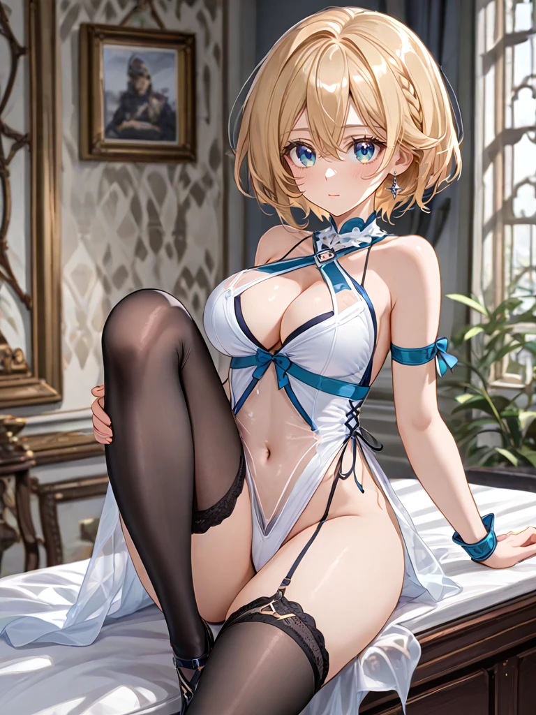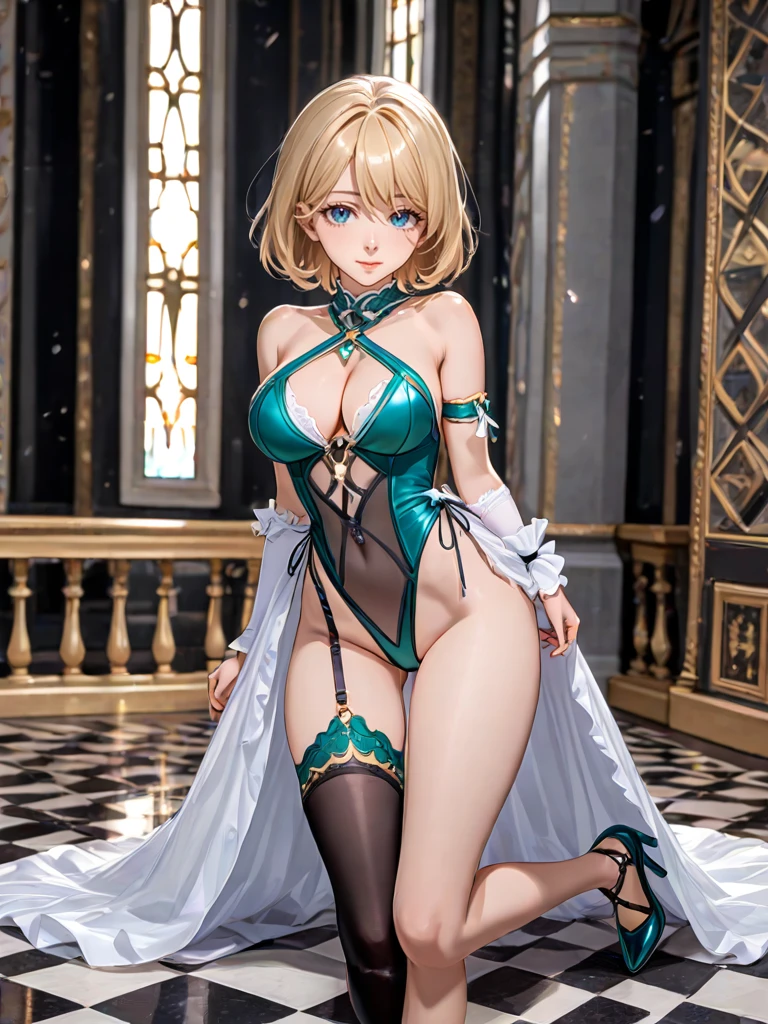1girl, Blond hair, short hair, black pupil, blue eyes with fade Green, leotard swimsuit, see-through dress, criss cross high heels, right leg thigh highs has leg garter, neck cloth, elbow gloves, wrist cuff