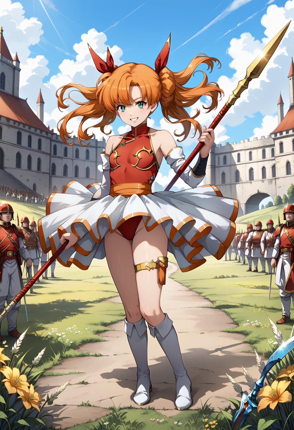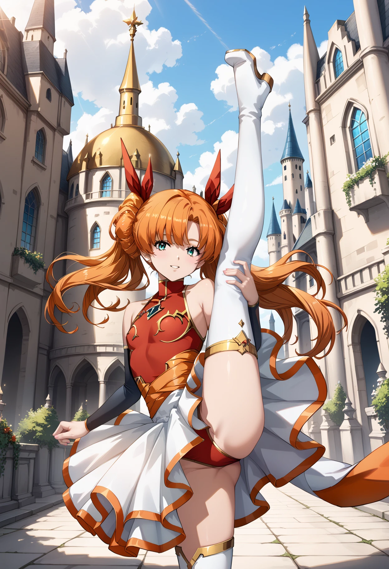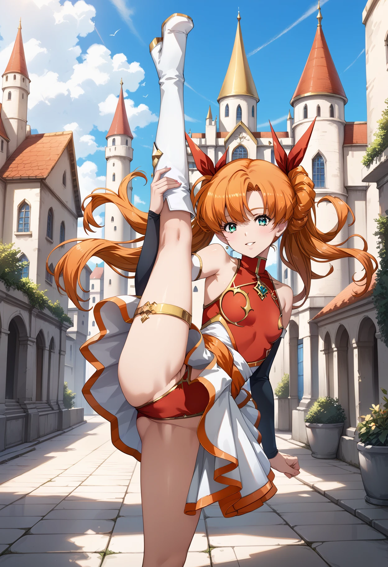 red leotard,detached sleeves,white pleated skirt,white footwear,